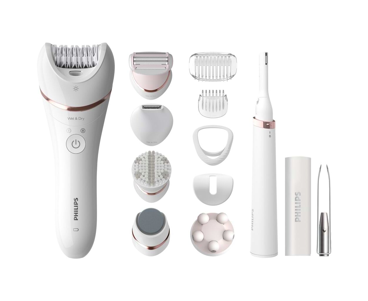 Гладкая кожа. Стопроцентная уверенность. Beauty Set 9000 – это комплексное решение для роскошной гладкой кожи от головы до пяток. Состоит из эпилятора и ручки-тримера. Благодаря разнообразным насадкам и аксессуарам подходит для отделки кожи, бровей, тела и ног.