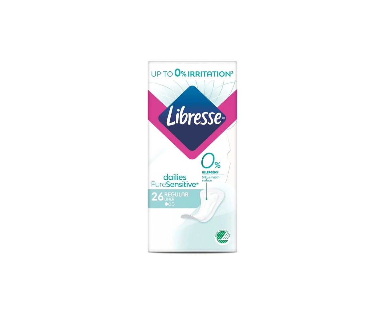 Мы разработали прокладки Libresse Pure Sensitive для чувствительной кожи. Шелковисто-гладкая поверхность прокладки содержит 0% аллергенов и является нежной, обеспечивая до 0% раздражений.