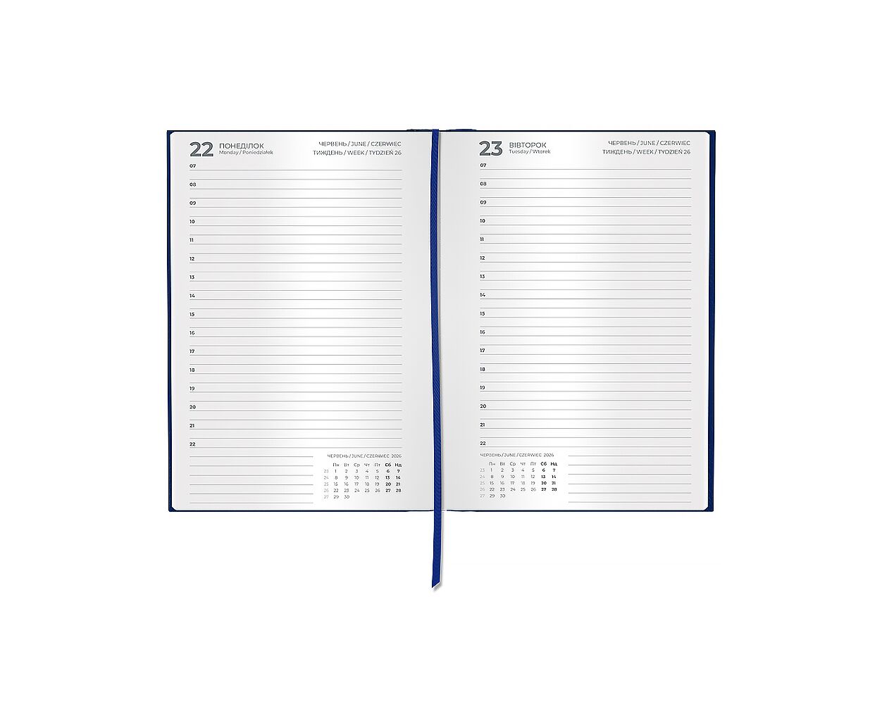 датированный, А5, количество листов - 168, 70 г/м², цвет бумаги - белый, пвх, Цвет - темно-синий, 14.5 х 2 х 21 см, 2026, украинский