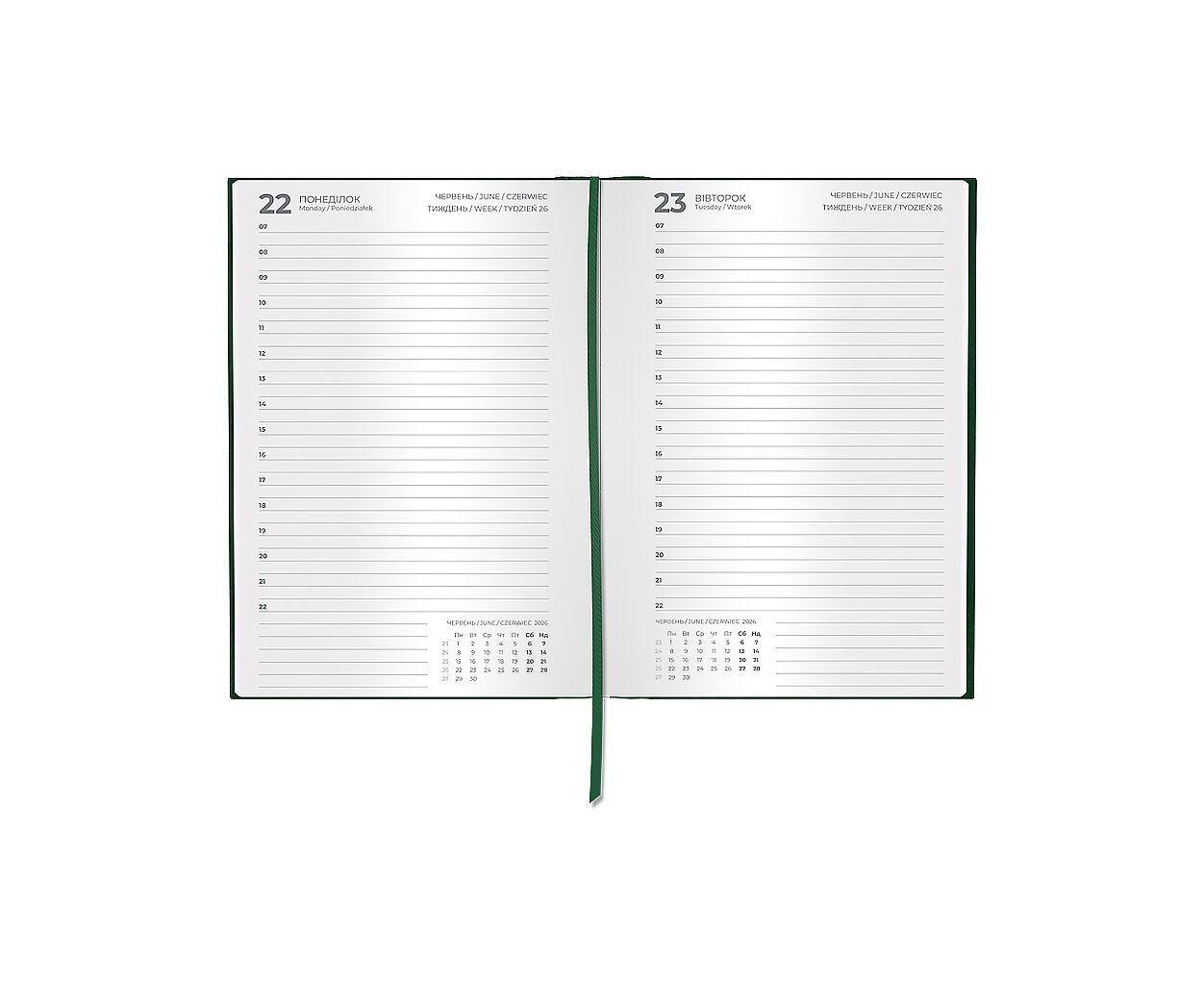 датированный, А5, количество листов - 168, 70 г/м², цвет бумаги - белый, пвх, Цвет - темно-зеленый, 14.5 х 2 х 21 см, 2026, украинский