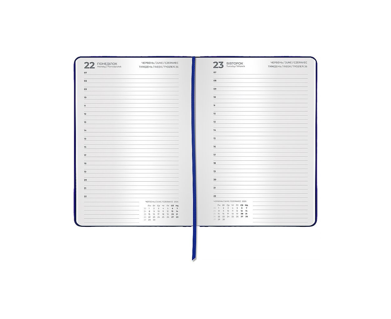 датированный, А5, количество листов - 168, 70 г/м², цвет бумаги - белый, PU, Цвет - темно-синий, 14.5 х 2 х 21 см, 2026, украинский, английский