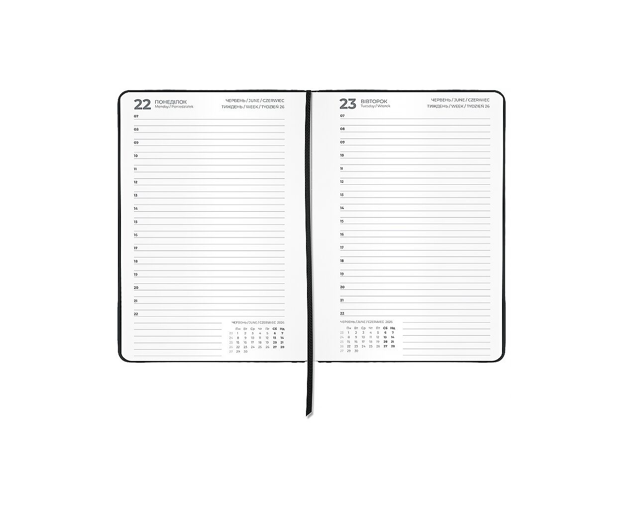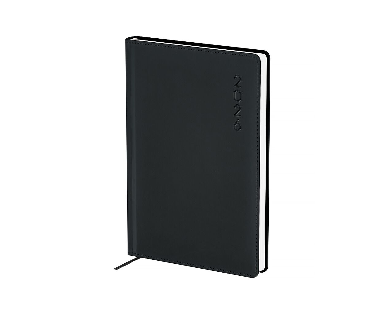датированный, А5, количество листов - 168, 70 г/м², цвет бумаги - белый, PU, Цвет - черный, 14.5 х 2 х 21 см, 2026, украинский, английский