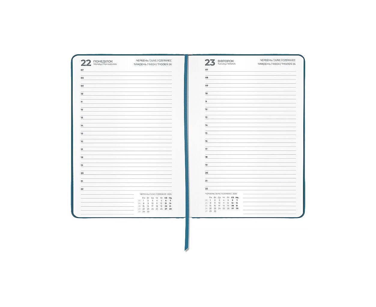 датированный, А5, количество листов - 168, 70 г/м², цвет бумаги - белый, PU, Цвет - синий, 14.5 х 2 х 21 см, 2026, украинский, английский