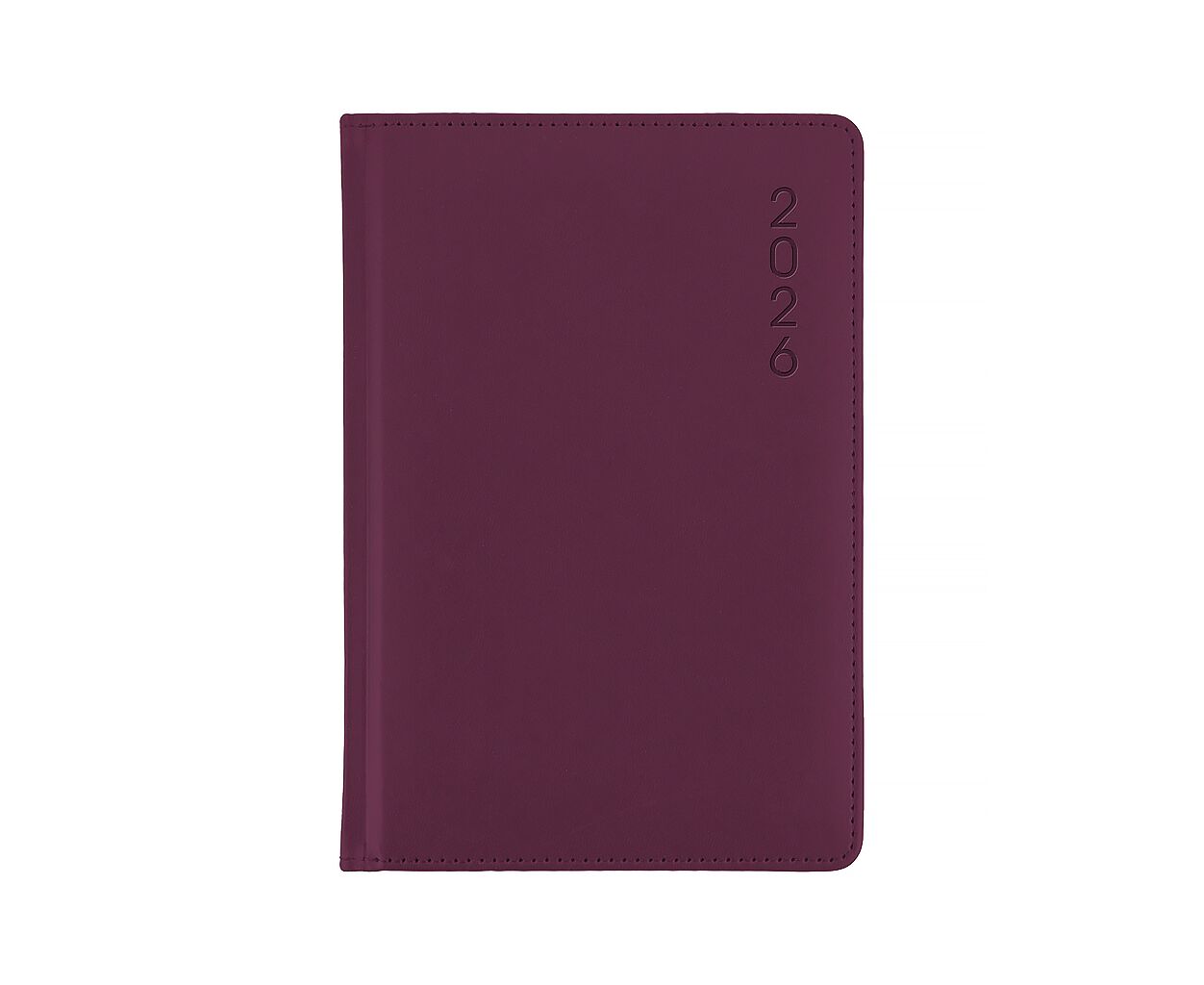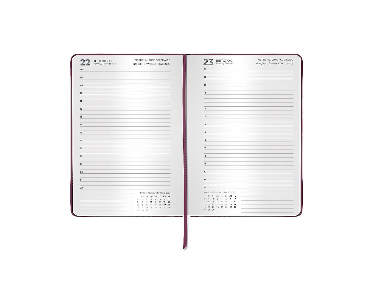 датированный, А5, количество листов - 168, 70 г/м², цвет бумаги - белый, PU, Цвет - сливовый, 14.5 х 2 х 21 см, 2026, украинский, английский