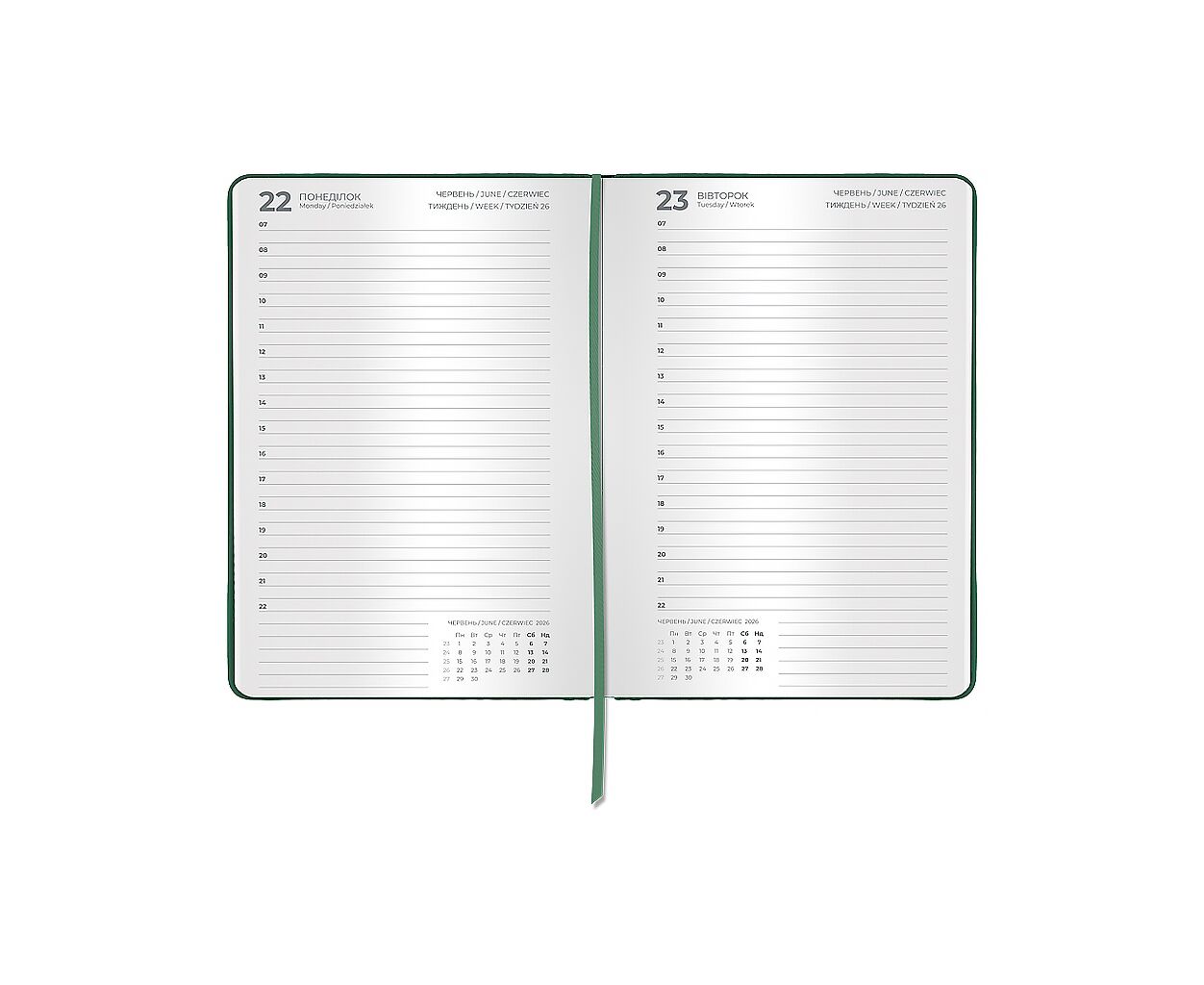 датированный, А5, количество листов - 168, 70 г/м², цвет бумаги - белый, PU, Цвет - зеленый, 14.5 х 2 х 21 см, 2026, украинский, английский