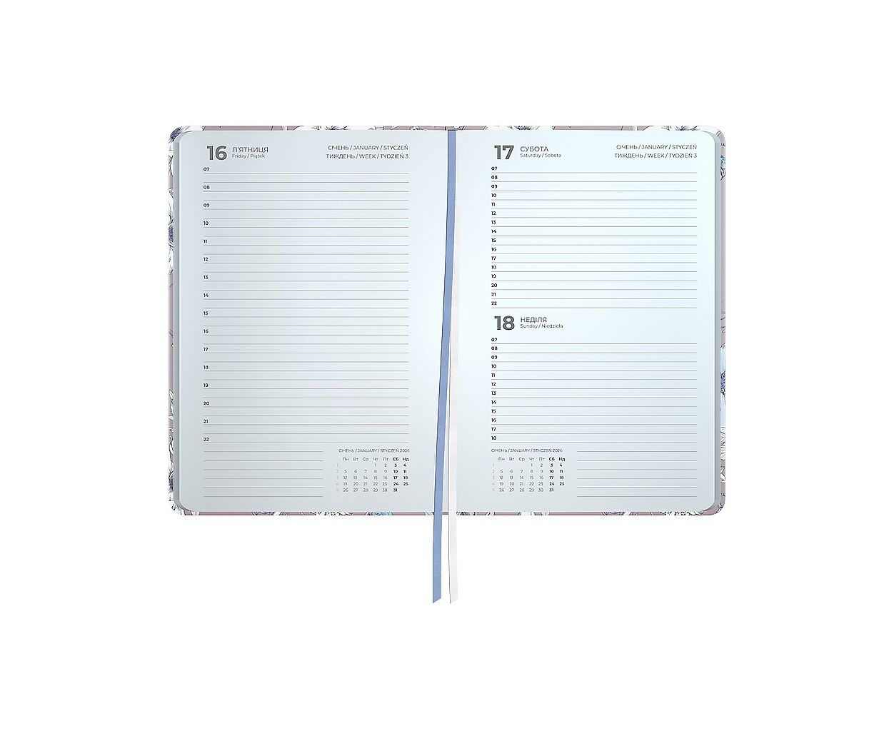 датированный, А5, количество листов - 168, 80 г/м², цвет бумаги - кремовый, PU, Цвет - лавандовый, 14.5 х 2 х 21 см, 2026, украинский, английский