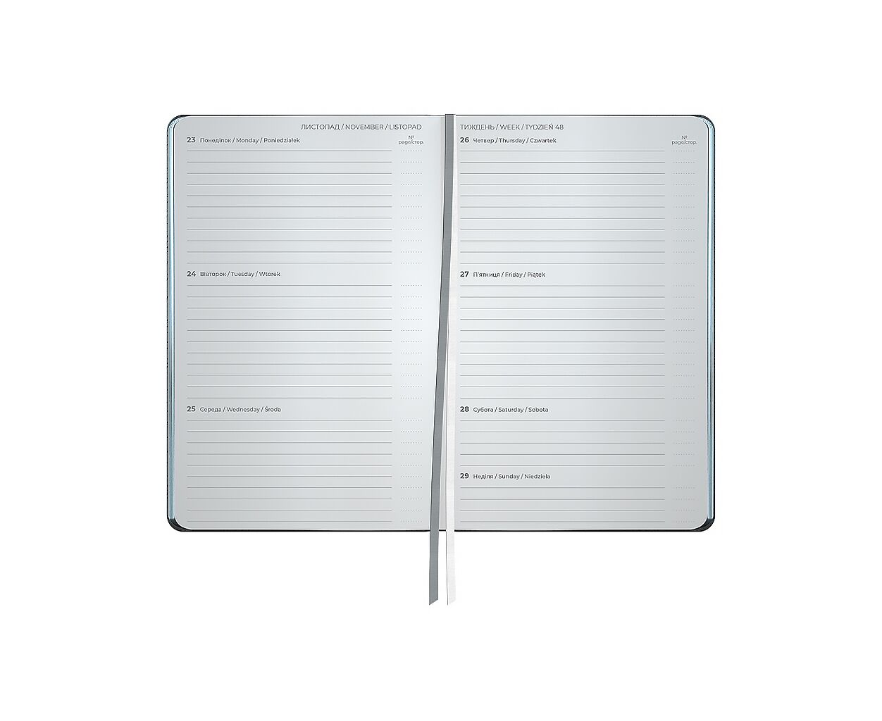 датированный, А5, количество листов - 96, 80 г/м², цвет бумаги - кремовый, PU, Цвет - серый, 12.5 х 2 х 19.5 см, 2026, украинский, английский