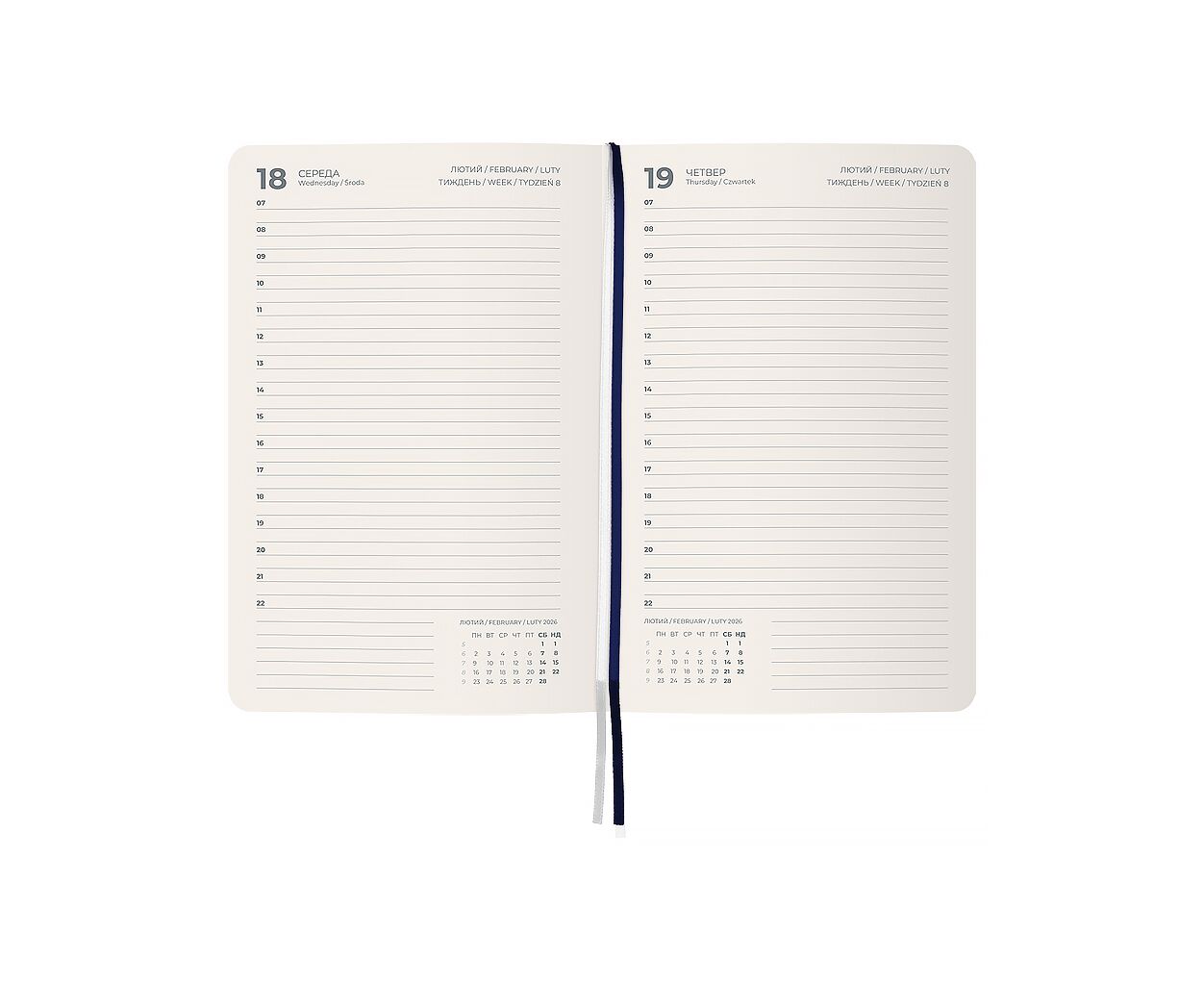 датированный, А5, количество листов - 168, 80 г/м², цвет бумаги - кремовый, PU, Цвет - синий, 14.5 х 2 х 21 см, 2026, украинский, английский