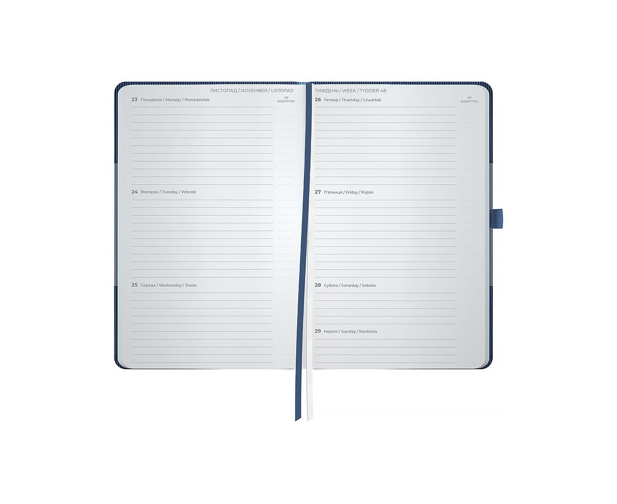 датированный, А5, количество листов - 96, 80 г/м², цвет бумаги - кремовый, PU, Цвет - голубой, 12.5 х 2 х 19.5 см, 2026, украинский, английский