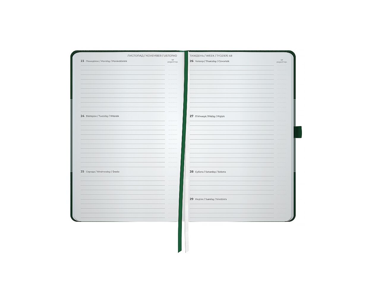 датированный, А5, количество листов - 96, 80 г/м², цвет бумаги - кремовый, PU, Цвет - темно-зеленый, 12.5 х 2 х 19.5 см, 2026, украинский, английский