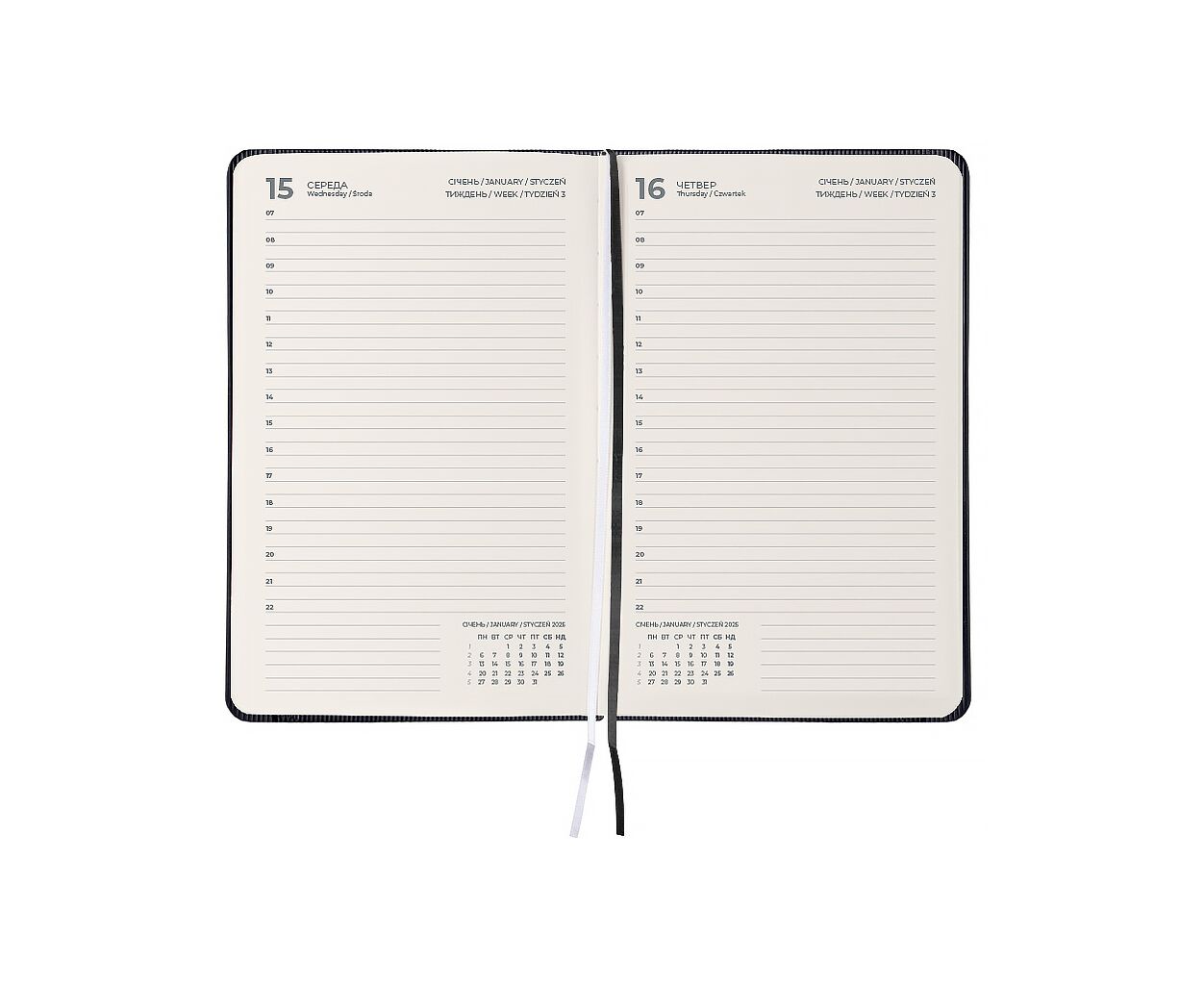 датированный, А5, количество листов - 168, 80 г/м², цвет бумаги - кремовый, PU, Цвет - черный, 14.5 х 2 х 21 см, 2026, украинский, английский