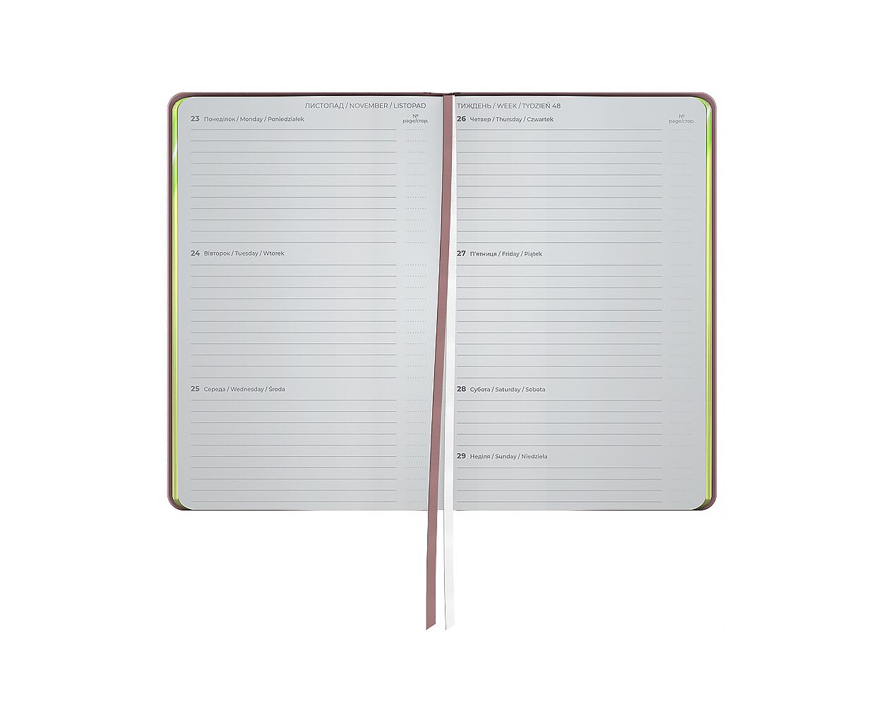датированный, А5, количество листов - 96, 80 г/м², цвет бумаги - кремовый, PU, Цвет - тёмно-розовый, 12.5 х 2 х 19.5 см, 2026, украинский, английский