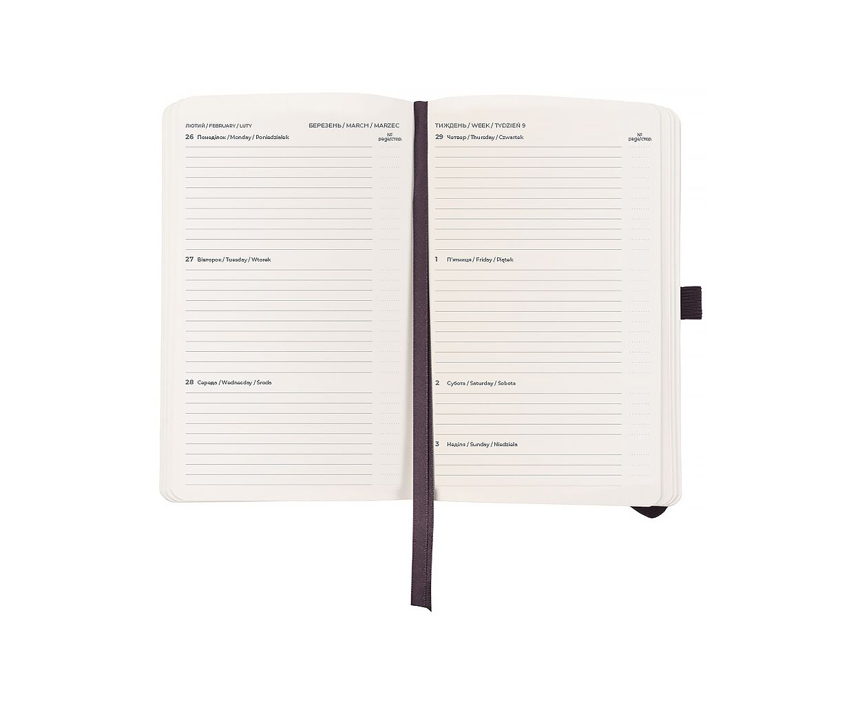 датированный, А5, количество листов - 96, 80 г/м², цвет бумаги - кремовый, PU, Цвет - черный, 195 х 125 мм, 2026, украинский, английский
