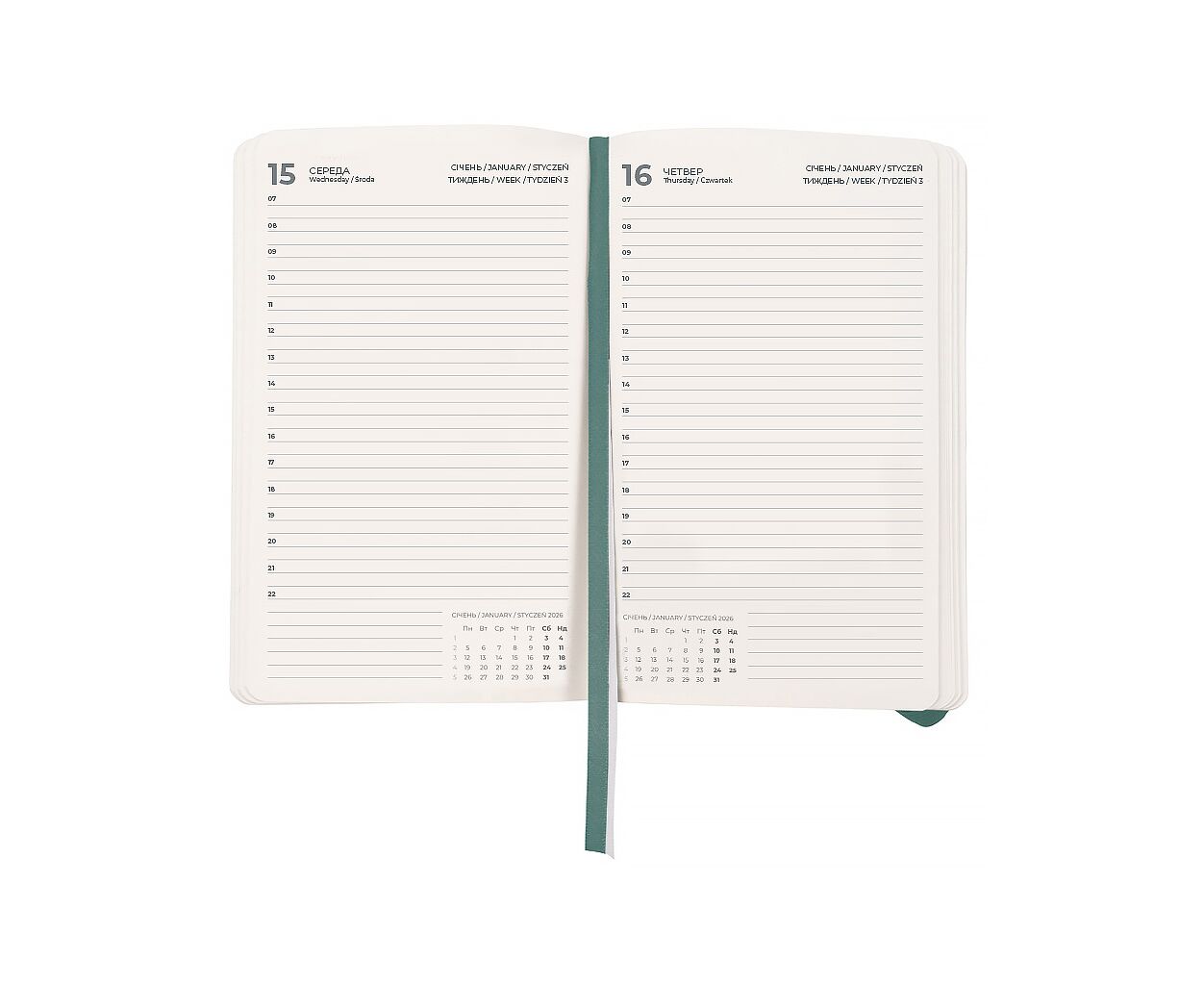 датированный, А5, количество листов - 168, 80 г/м², цвет бумаги - кремовый, PU, Цвет - бирюзовый, 14.5 х 2 х 21 см, 2026, украинский, английский