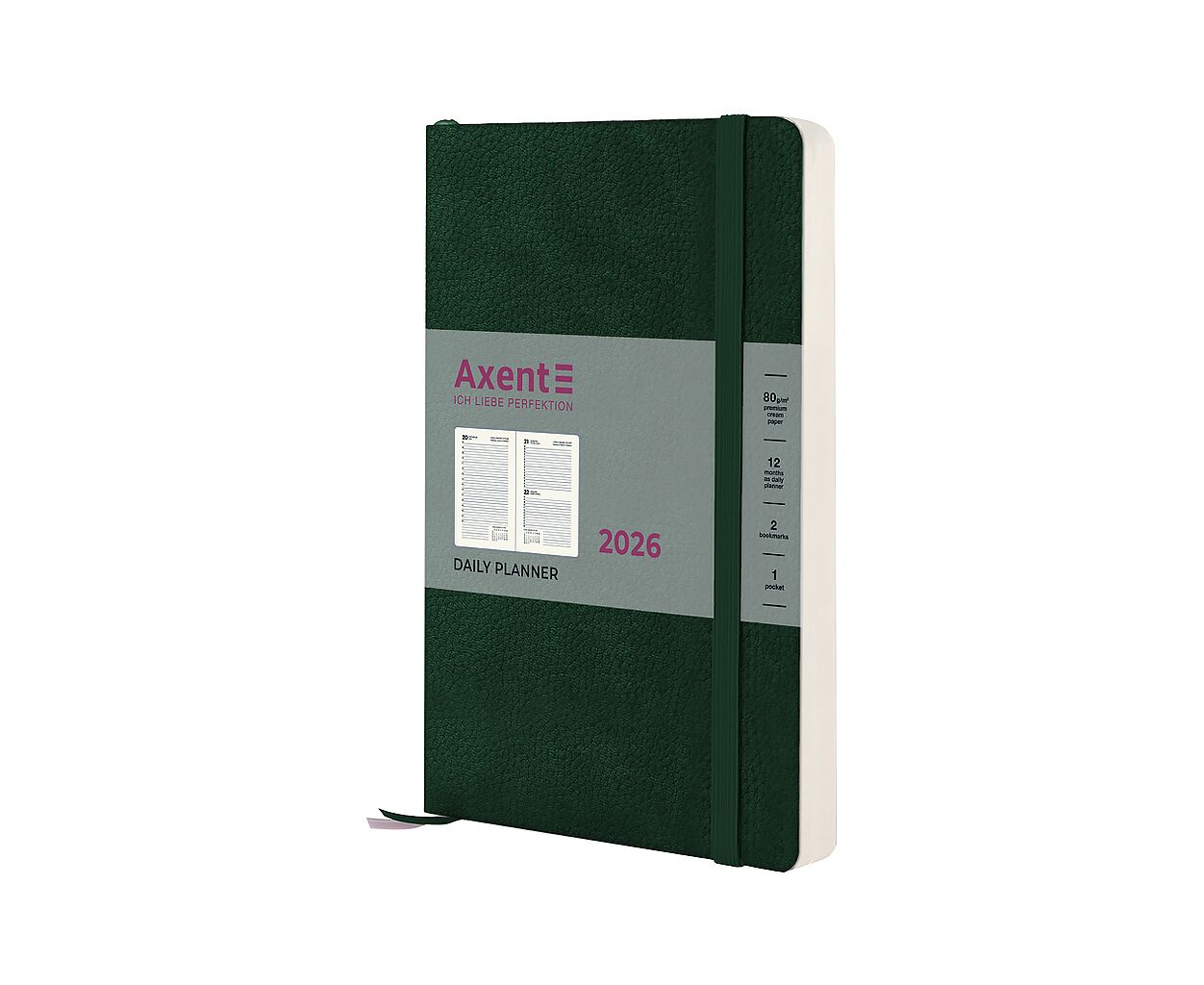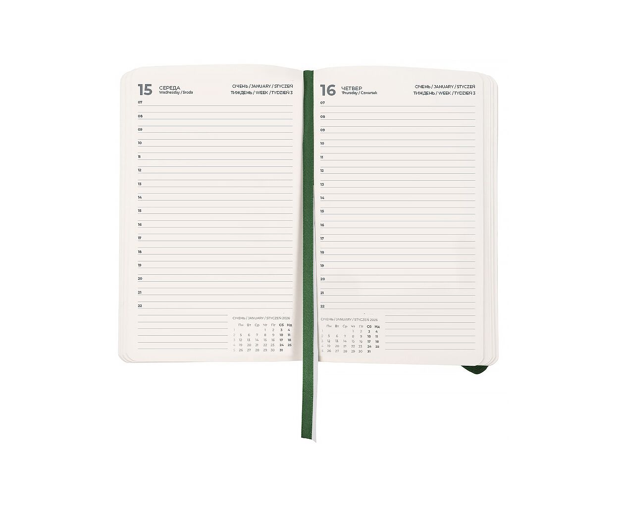 датированный, А5, количество листов - 168, 80 г/м², цвет бумаги - кремовый, PU, Цвет - темно-зеленый, 14.5 х 2 х 21 см, 2026, украинский, английский