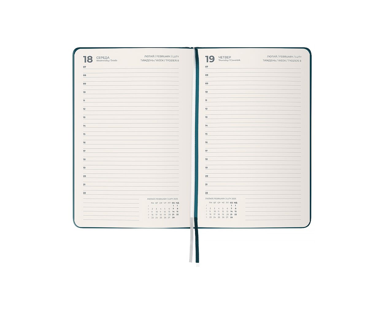 датированный, А5, количество листов - 168, 80 г/м², цвет бумаги - кремовый, пвх, 14.5 х 2 х 21 см, 2026, украинский, английский