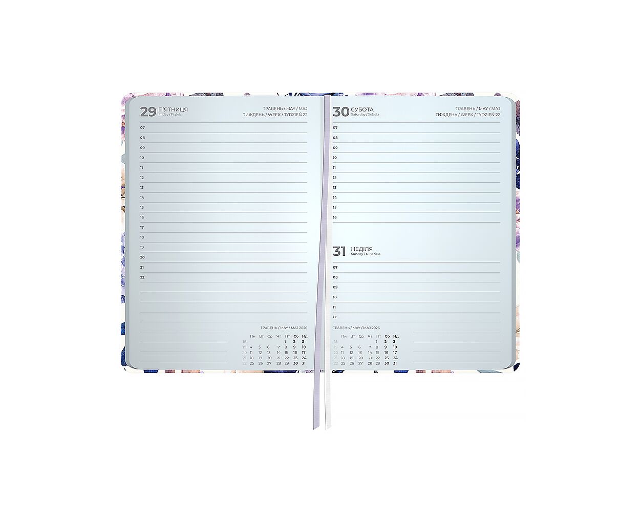 датированный, А6, количество листов - 168, 80 г/м², цвет бумаги - кремовый, PU, Цвет - разноцветный, 14.5 х 2 х 21 см, 2026, украинский, английский