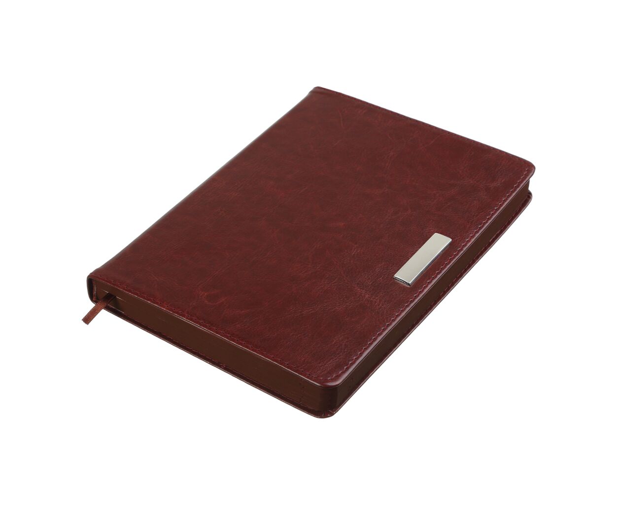 Гибкая обложка еженедельника SALERNO выполнена из гладкой искусственной кожи. Уникальным элементом дизайна является металлический декор – табличка на лицевой стороне обложки. Гармонично дополняет дизайн слепое тиснение года на корне, тонированный в цвет обложки срез внутреннего блока.