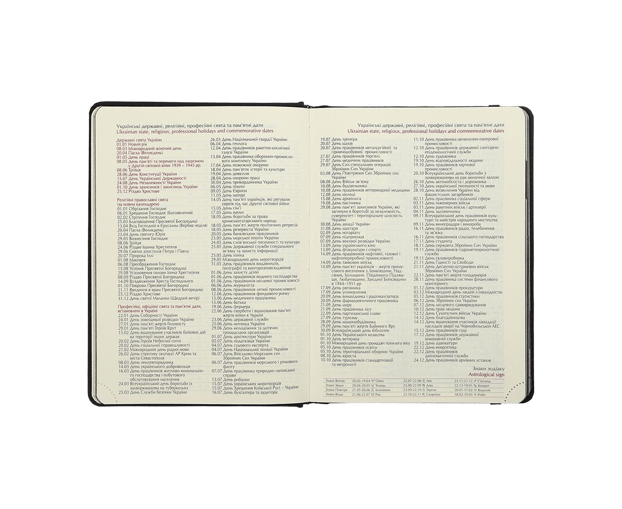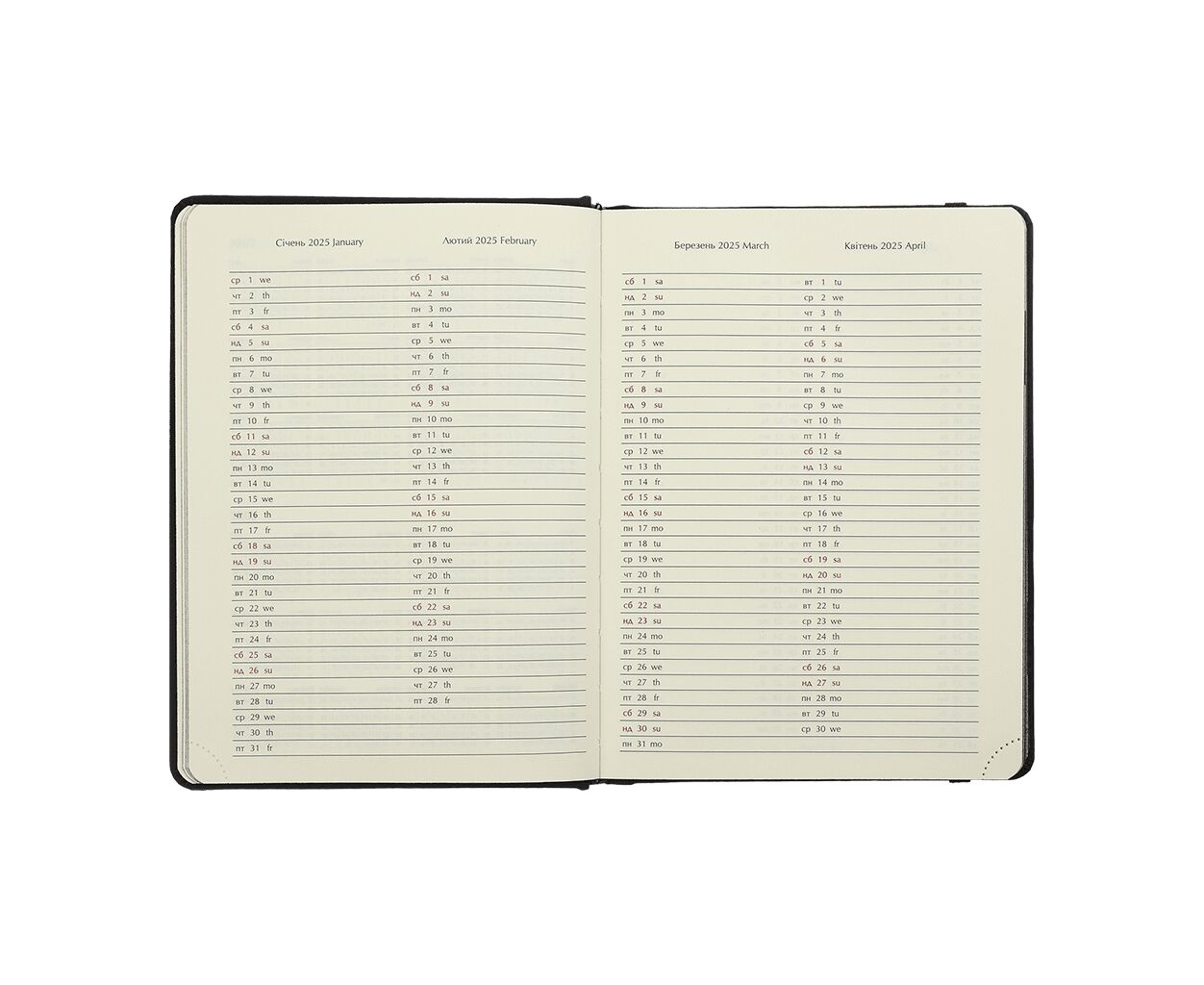 датированный, А5, количество листов - 336, 70 г/м², цвет бумаги - кремовый, искусственная кожа, Цвет - черный, 2026, украинский, английский