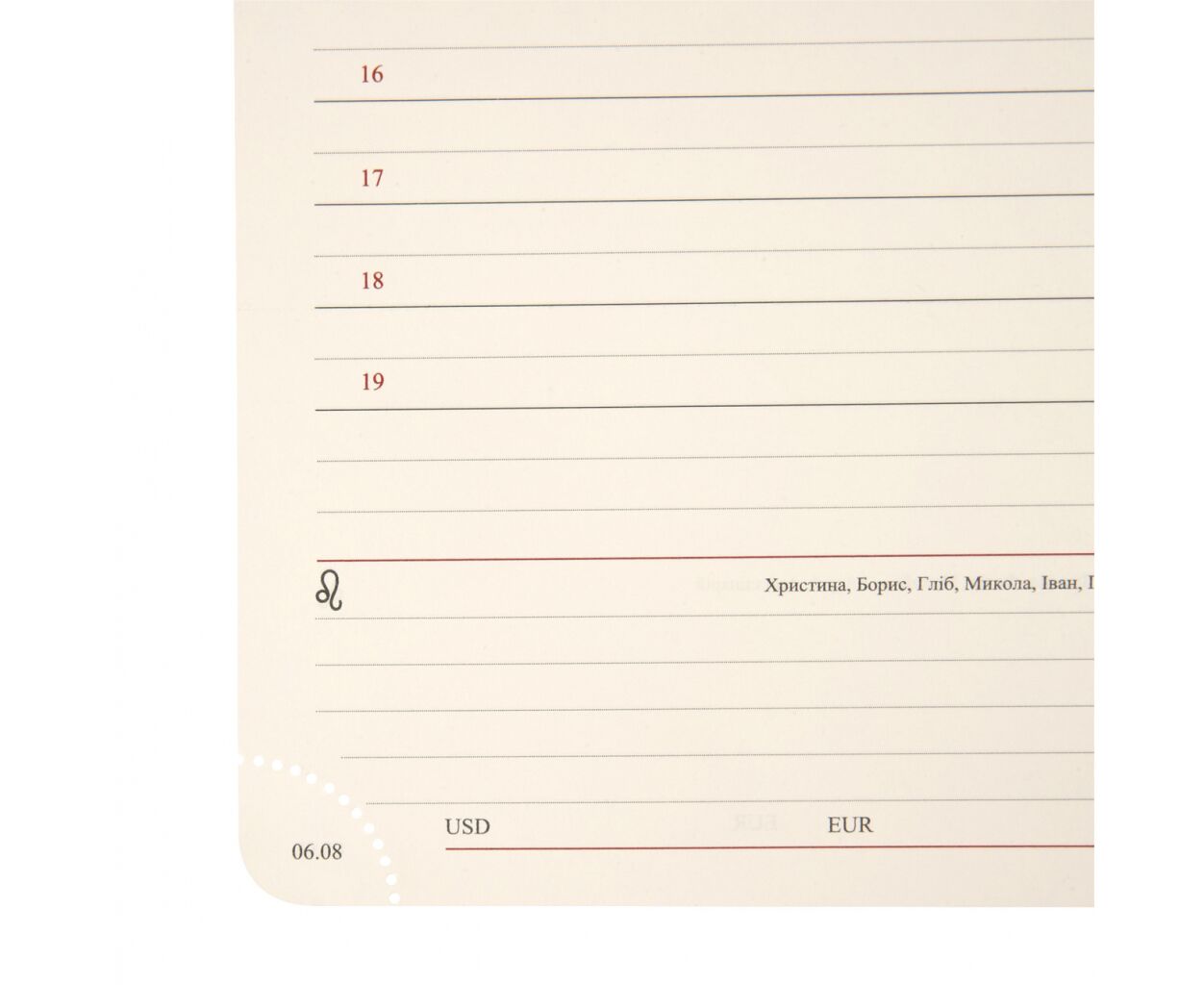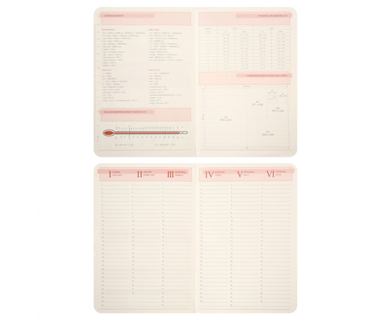 Бумажный блок продуман до мелочей для комфортного ежедневного использования. Он насчитывает 368 страниц, что обеспечивает достаточно места для ежедневных записей, планов и заметок. Бумага плотностью 80 г/м² позволяет комфортно писать ручкой или карандашом без просвечивания. Кремовая бумага не утомляет глаза даже при длительной работе. Закругленные углы бумажного блока не только придают стильный вид, но и предотвращают быстрый износ страниц. Это практическое решение для сохранения деловой записной книжки чистоплотным в ежедневном пользовании. Перфорированные углы бумажного блока позволяют легко маркировать текущую страницу. Это удобный функциональный элемент, который позволяет быстро ориентироваться в записях и держать планирование под контролем. Цветной бумажный срез придает дизайнерский акцент и визуальную выразительность. Стильное решение для тех, кто ценит оригинальность.