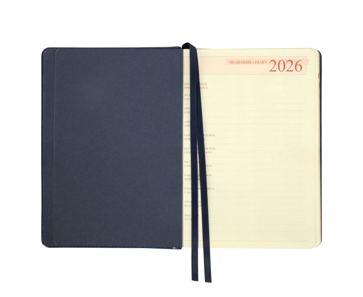 датированный, А5, количество листов - 368, 80 г/м², цвет бумаги - кремовый, PU, Цвет - синий, 21 х 15 х 2 см, 2026, украинский