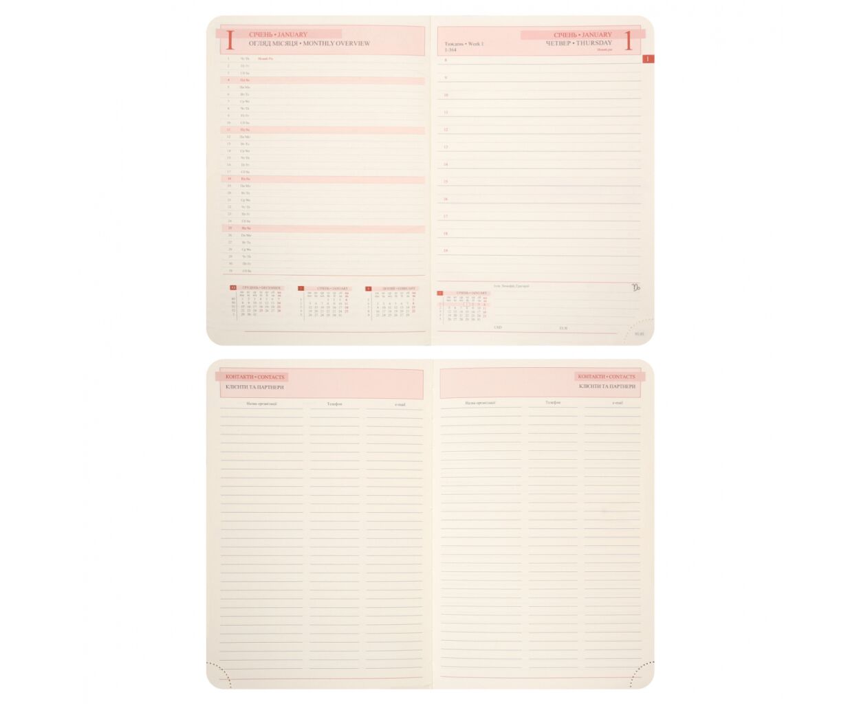 Бумажный блок продуман до мелочей для комфортного ежедневного использования. Он насчитывает 368 страниц, что обеспечивает достаточно места для ежедневных записей, планов и заметок. Бумага плотностью 80 г/м² позволяет комфортно писать ручкой или карандашом без просвечивания. Кремовая бумага не утомляет глаза даже при длительной работе. Закругленные углы бумажного блока не только придают стильный вид, но и предотвращают быстрый износ страниц. Это практическое решение для сохранения деловой записной книжки чистоплотным в ежедневном пользовании. Перфорированные углы бумажного блока позволяют легко маркировать текущую страницу. Это удобный функциональный элемент, который позволяет быстро ориентироваться в записях и держать планирование под контролем. Бумажный срез в цвет бумажного блока – сдержанное классическое решение, поддерживающее общую гармонию дизайна. Идеально для тех, кто предпочитает минимализм.