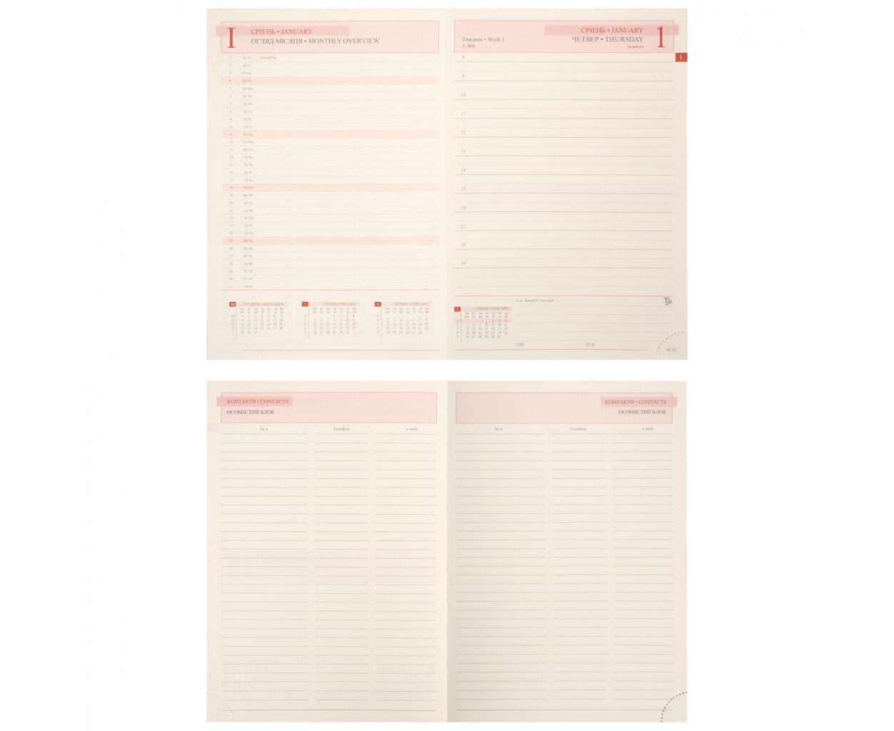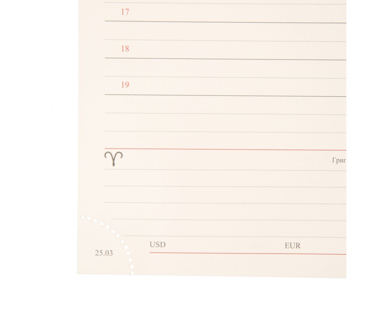 Бумажный блок продуман до мелочей для комфортного ежедневного использования. Он насчитывает 368 страниц, что обеспечивает достаточно места для ежедневных записей, планов и заметок. Бумага плотностью 80 г/м² позволяет комфортно писать ручкой или карандашом без просвечивания. Кремовая бумага не утомляет глаза даже при длительной работе. Перфорированные углы бумажного блока позволяют легко маркировать текущую страницу. Это удобный функциональный элемент, который позволяет быстро ориентироваться в записях и держать планирование под контролем. Цветной бумажный срез придает дизайнерский акцент и визуальную выразительность. Стильное решение для тех, кто ценит оригинальность.