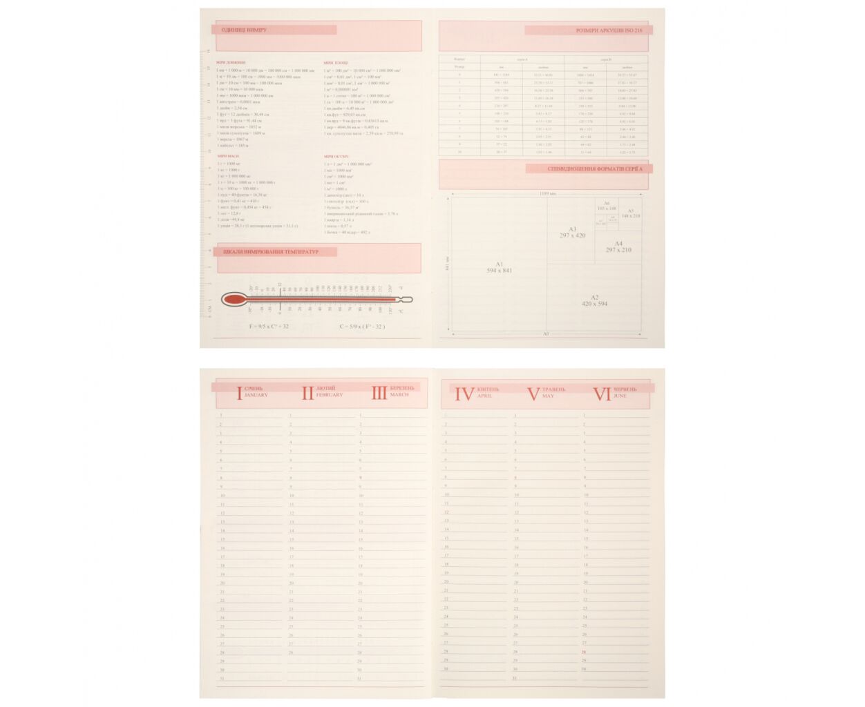 Бумажный блок продуман до мелочей для комфортного ежедневного использования. Он насчитывает 368 страниц, что обеспечивает достаточно места для ежедневных записей, планов и заметок. Бумага плотностью 80 г/м² позволяет комфортно писать ручкой или карандашом без просвечивания. Кремовая бумага не утомляет глаза даже при длительной работе. Перфорированные углы бумажного блока позволяют легко маркировать текущую страницу. Это удобный функциональный элемент, который позволяет быстро ориентироваться в записях и держать планирование под контролем. Цветной бумажный срез придает дизайнерский акцент и визуальную выразительность. Стильное решение для тех, кто ценит оригинальность.