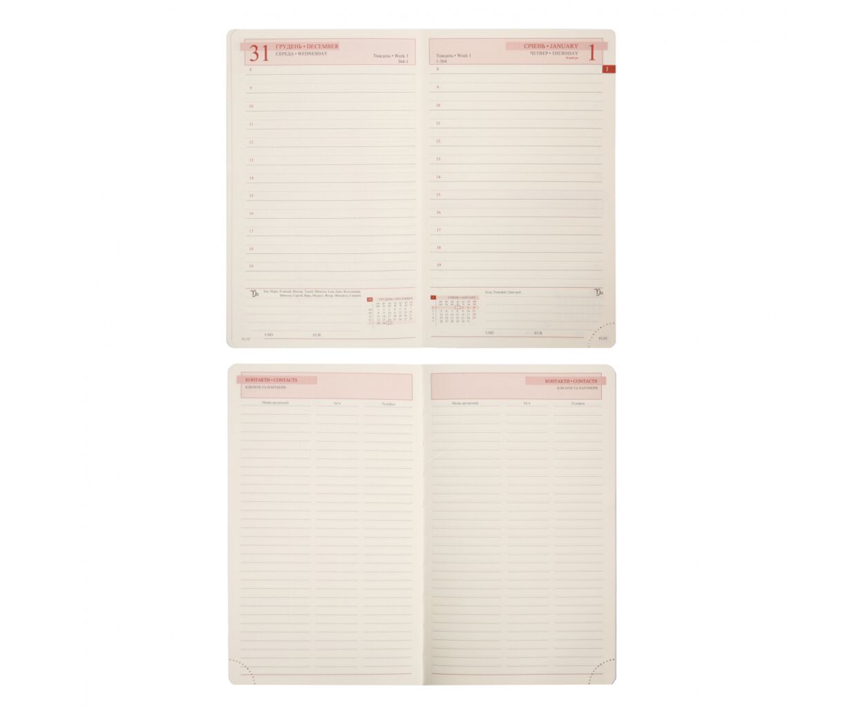 Бумажный блок продуман до мелочей для комфортного ежедневного использования. Он насчитывает 352 страниц, что обеспечивает достаточно места для ежедневных записей, планов и заметок. Бумага плотностью 80 г/м² позволяет комфортно писать ручкой или карандашом без просвечивания. Кремовая бумага не утомляет глаза даже при длительной работе. Закругленные углы бумажного блока не только придают стильный вид, но и предотвращают быстрый износ страниц. Это практическое решение для сохранения деловой записной книжки чистоплотным в ежедневном пользовании. Перфорированные углы бумажного блока позволяют легко маркировать текущую страницу. Это удобный функциональный элемент, который позволяет быстро ориентироваться в записях и держать планирование под контролем. Цветной бумажный срез придает дизайнерский акцент и визуальную выразительность. Стильное решение для тех, кто ценит оригинальность.