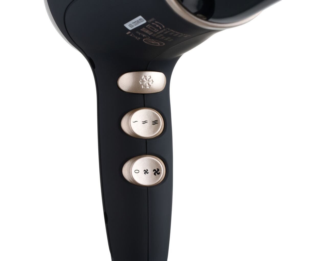 Режимы работы. Максимальная мощность фена равна 2200 Вт. Двигатель с такими показателями способен на обеспечение 3 температурных режимов и 2 режимов скорости. Переключаются они посредством кнопок на рукояти, легко нажимаемым одной рукой.