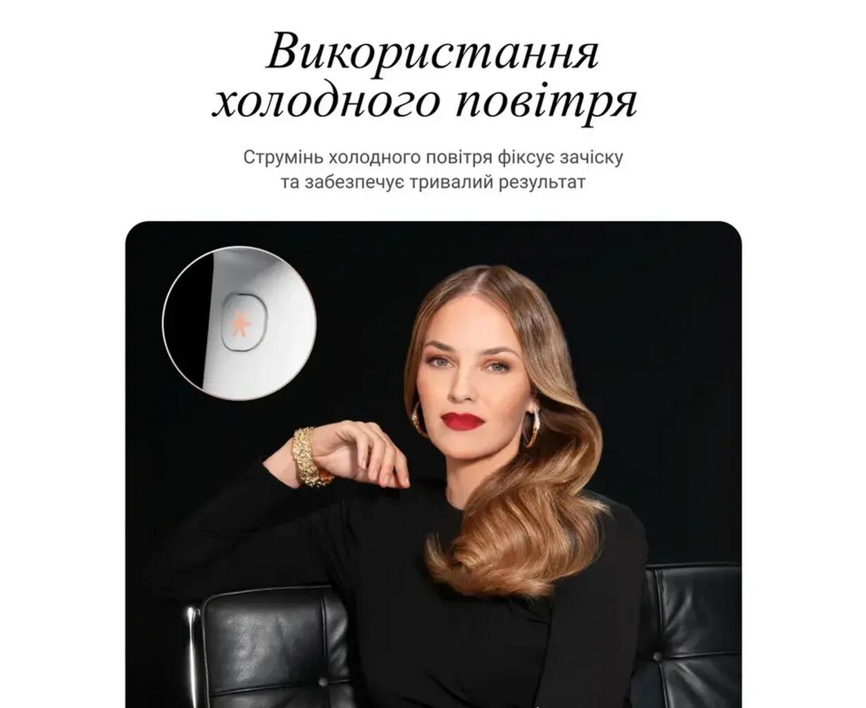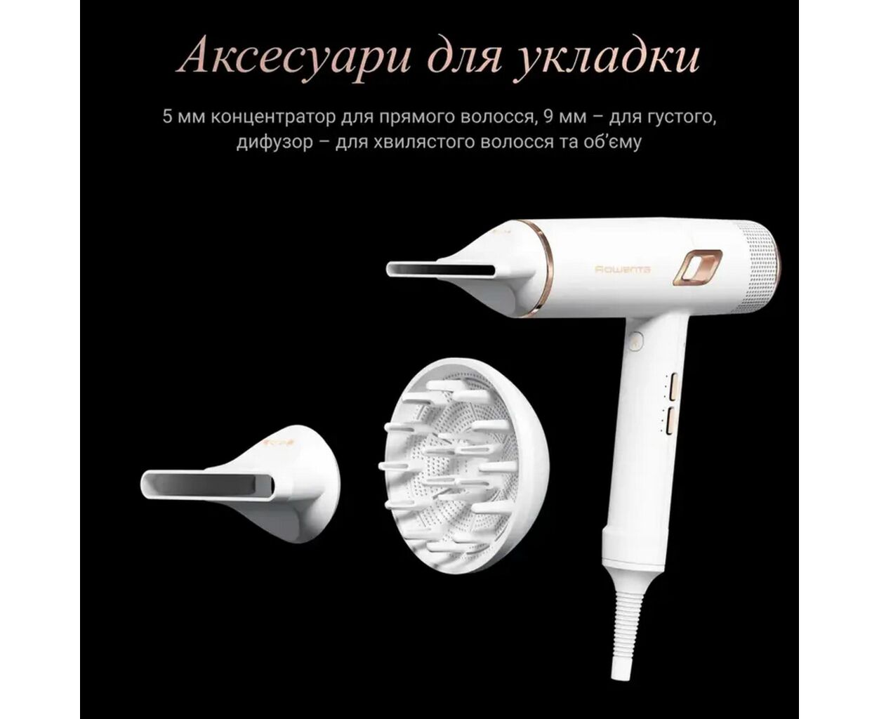 Фен оснащен тонким концентратором 5 мм для идеальной сушки прямых волос, 9 мм концентратором – для густых волос, а также диффузором – для естественных волнистых волос и придания объема.