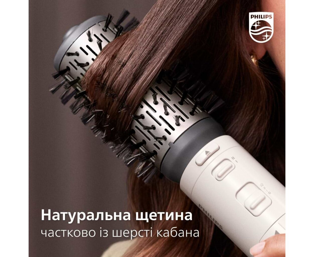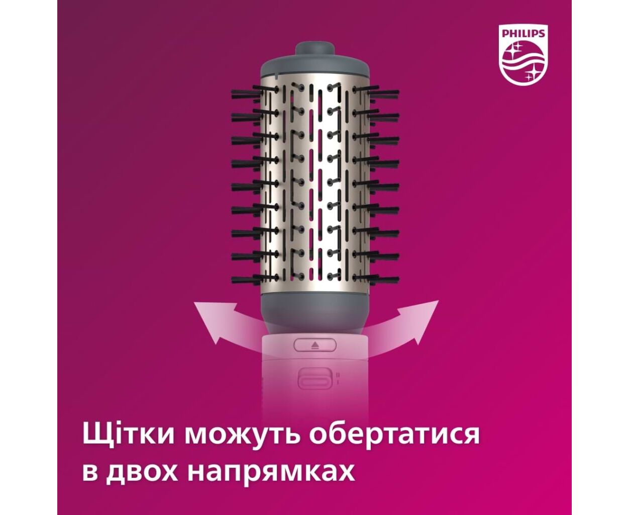 Вращающаяся щетка из натуральной щетины диаметром 50 мм придает объем и естественный вид, а щетка с втягиваемой щетиной помогает уложить волосы волнами, не спутывая их.