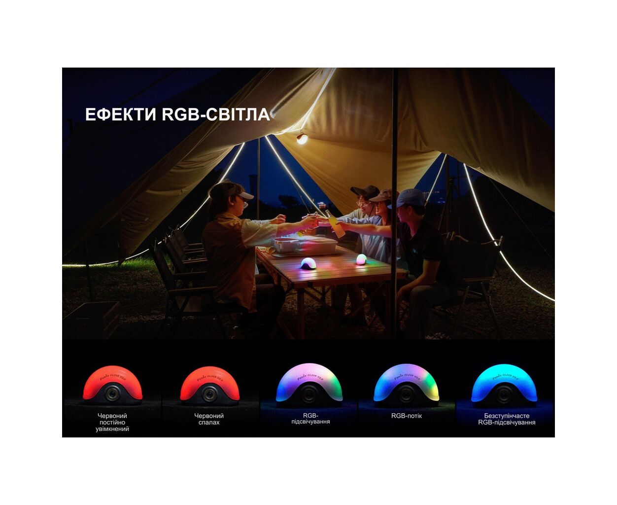 Одной из главных особенностей Fenix CL20R V.2.0 является поразительная яркость в 300 люмен, обеспечивающая качественное освещение на расстоянии до 12 метров. Источником света служат 27 SMD светодиодов 2835 и 24 RGB-диода 2020, что гарантирует стабильную работу фонаря до 50000 часов. Для разнообразия освещения предусмотрено 13 режимов, включая "лунное сияние", красный свет, а также режим RGB для красочных световых эффектов, которые добавят особого настроения вашим вечеринкам на природе.