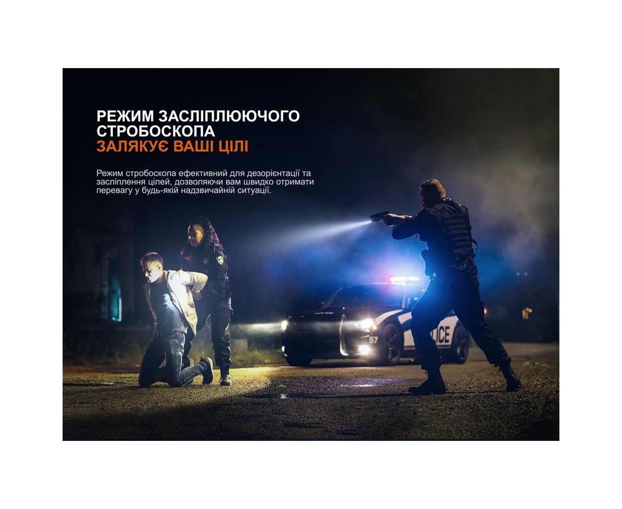 Фонарь имеет два режима работы: постоянный свет и стробоскоп, которые переключаются с помощью двух хвостовых переключателей. Они удобны для работы правой или левой рукой, что особенно ценится в стрессовых ситуациях. Система блокировки предотвращает случайное включение, защищая аккумулятор от разрядки.
