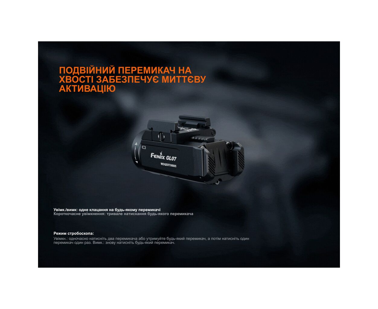 Fenix GL07 оснащен универсальным быстросъемным креплением, совместимым с планками Glock и Picatinny, что повышает его совместимость с различными моделями оружия, от полноразмерных до компактных устройств, таких как Springfield Hellcat. Это важное преимущество для профессионалов, которым нужен адаптивный инструмент для быстрой замены.