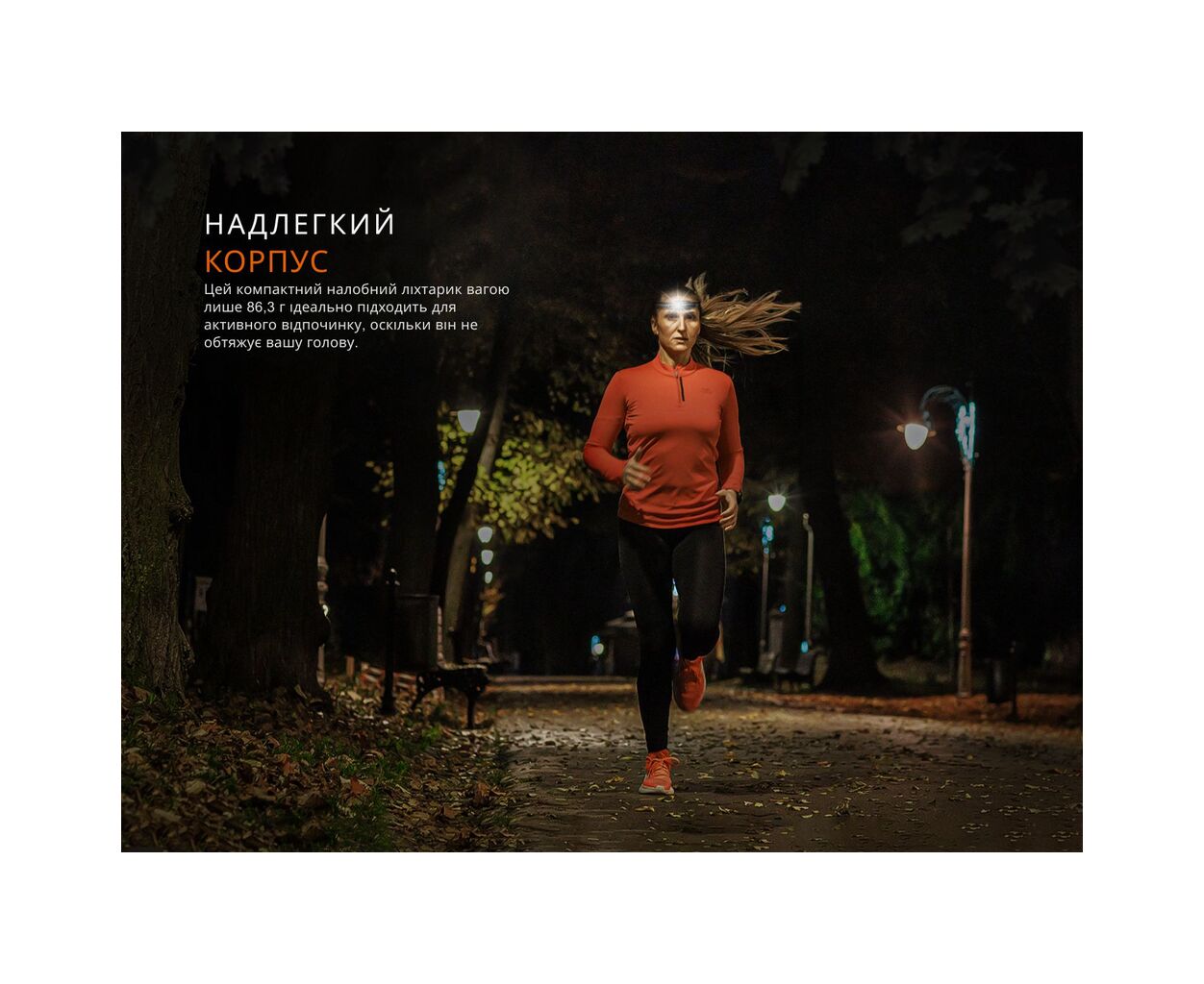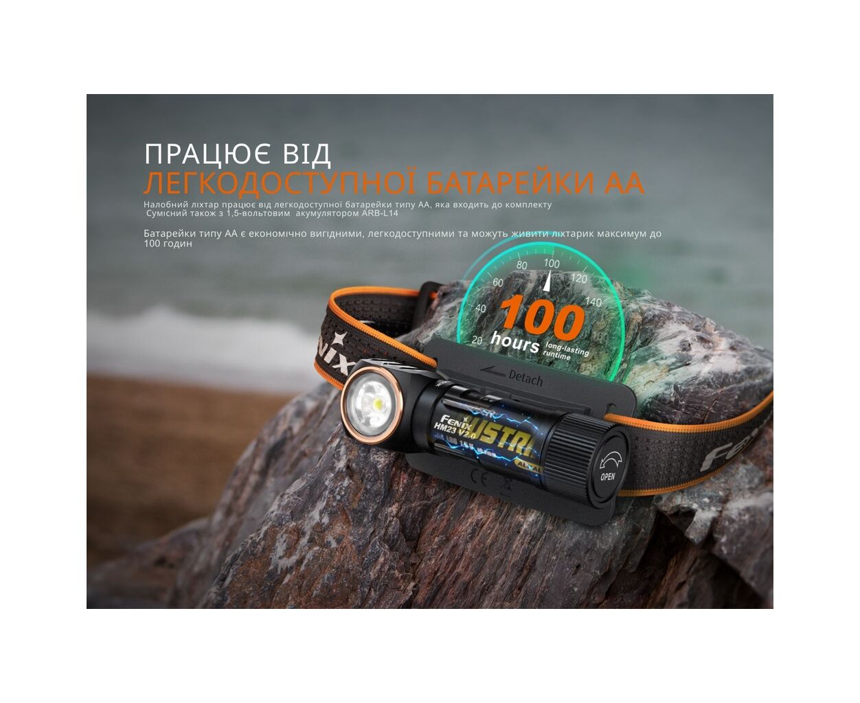 Fenix HM23 V2.0 питается от легко доступной AA батареи, входящей в комплект, или от аккумулятора 14500 (1.5 В), что позволяет использовать его до 100 часов без подзарядки в зависимости от выбранного режима. Компактный размер в 73.6 мм в длину и вес всего 86.3 г делают его едва ощутимым на голове, что обеспечивает максимальный комфорт при ношении.