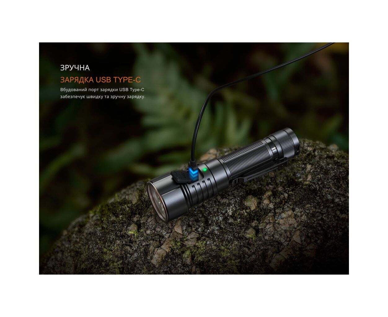 Аккумулятор заряжается через влагозащищенный  порт USB-C  в голове фонаря. Время зарядки составляет 3.5 ч при использовании зарядного адаптера 5 В/2.5 А.