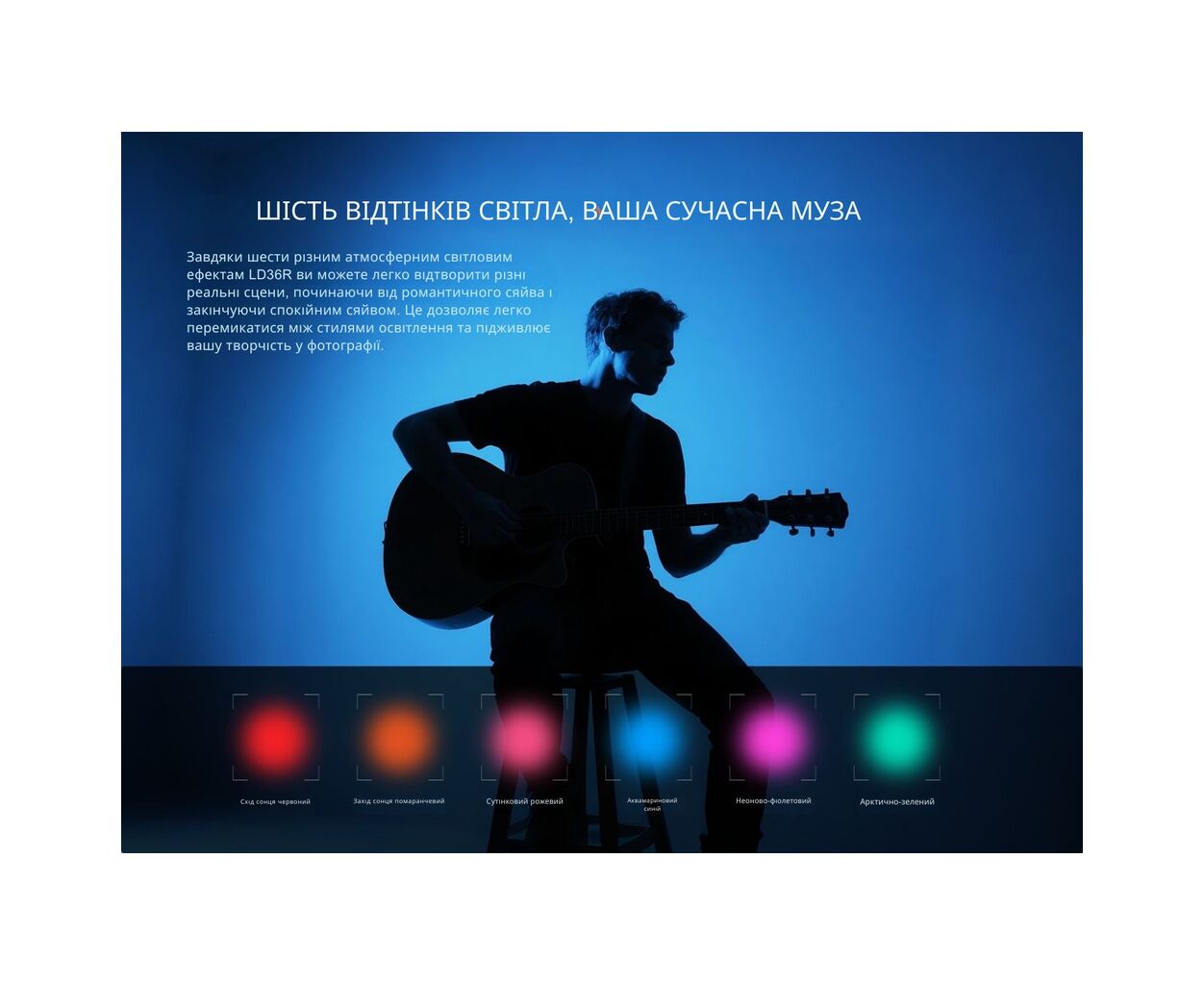Цветные диоды излучают свет в  6 разных оттенках , позволяя настраивать освещение под текущее настроение и потребности для создания контента. Срок службы каждого светодиода составляет 50000 часов.
