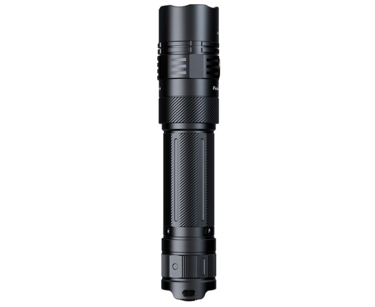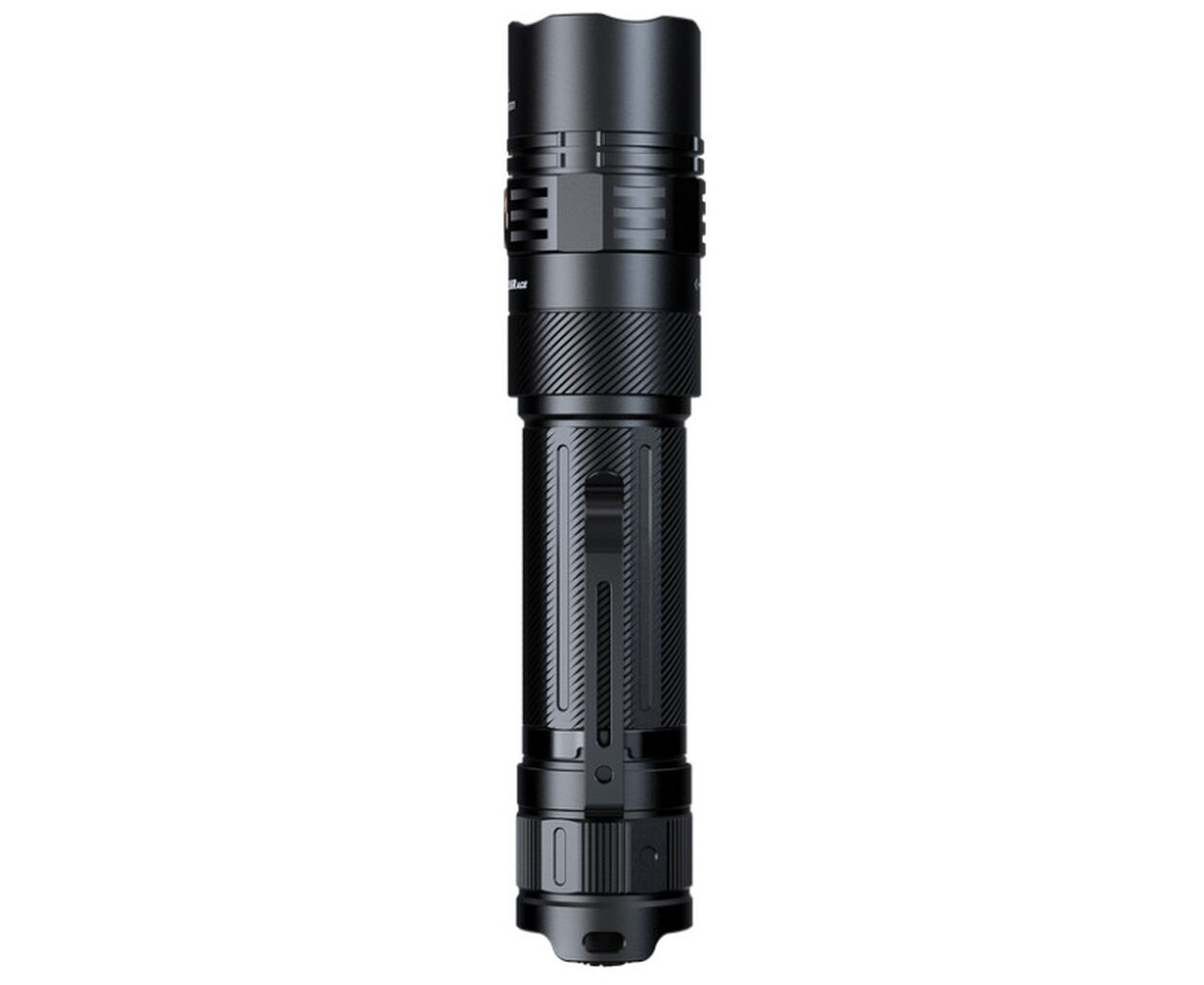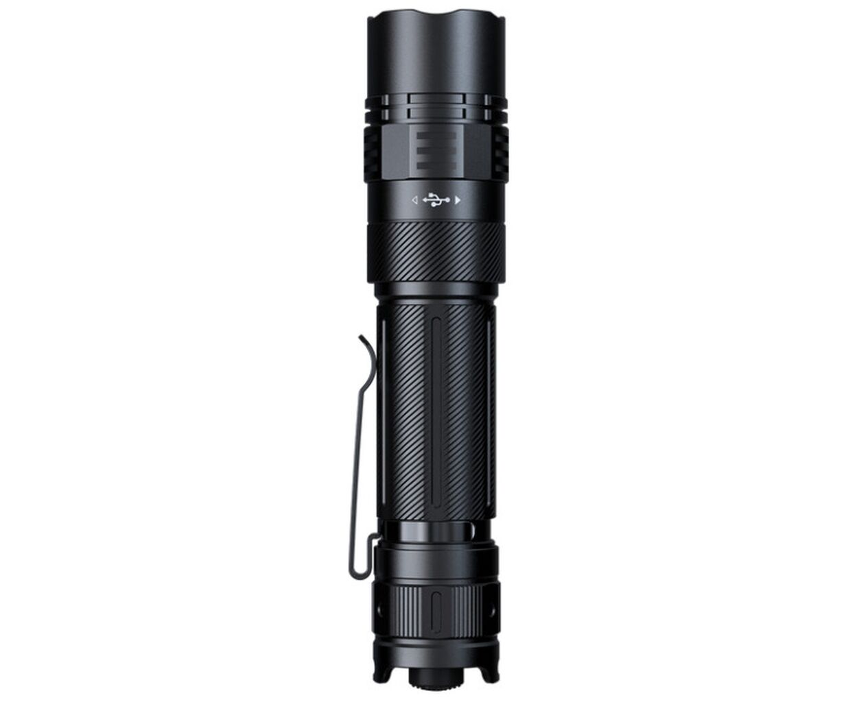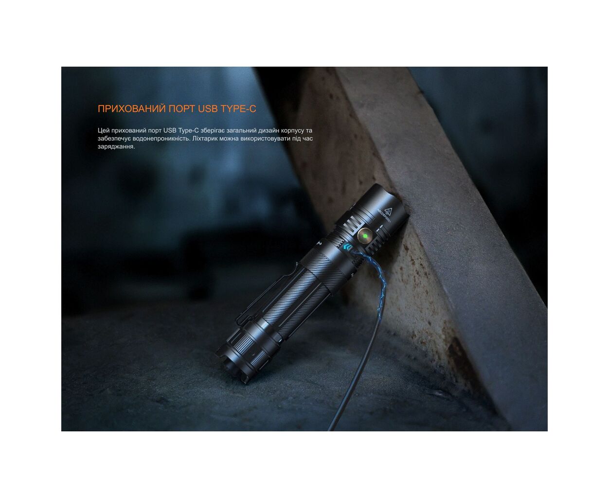 В комплект входит Li-ion аккумулятор 21700 – Fenix ARB-L21-5000 V2.0 емкостью 5000 мА·ч. Зарядка осуществляется через скрытый порт USB-C, время зарядки составляет около 3 часов. Во время зарядки фонарь может работать. Световая индикация в кнопке отображает уровень заряда в четырех состояниях: зеленый (100–85%), мигающий зеленый (85–50%), красный (50–25%), мигающий красный (25–1%). Есть защита от обратной полярности и предупреждение о низком напряжении.