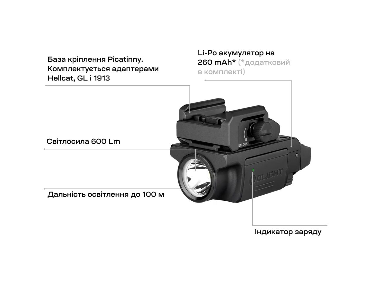 Тип - подствольный, источник света - LED, дальность светового потока - 100 м, аккумулятор, яркость - 600 люмен, элементы питания - Li-Po, вес - 68 г