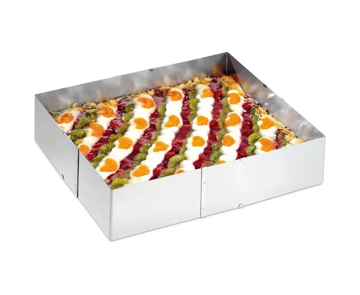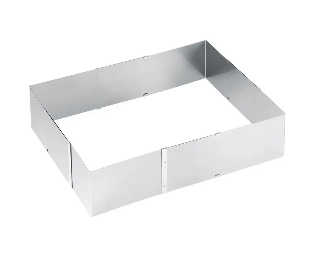 Рамка для выпечки UNO имеет высоту 8,5 см и предназначена для приготовления пирожных и тортов с большим количеством начинки. Она регулируется от 20 x 24 см до 38 x 46 см, что позволяет адаптировать ее под разные противни. Высокие края формы помогают тесту сохранять форму и предотвращают утечку начинки. Также подходит для приготовления холодных десертов, например с йогуртовой или творожной начинкой. После выпечки можно охладить основание и добавить начинку по вкусу.