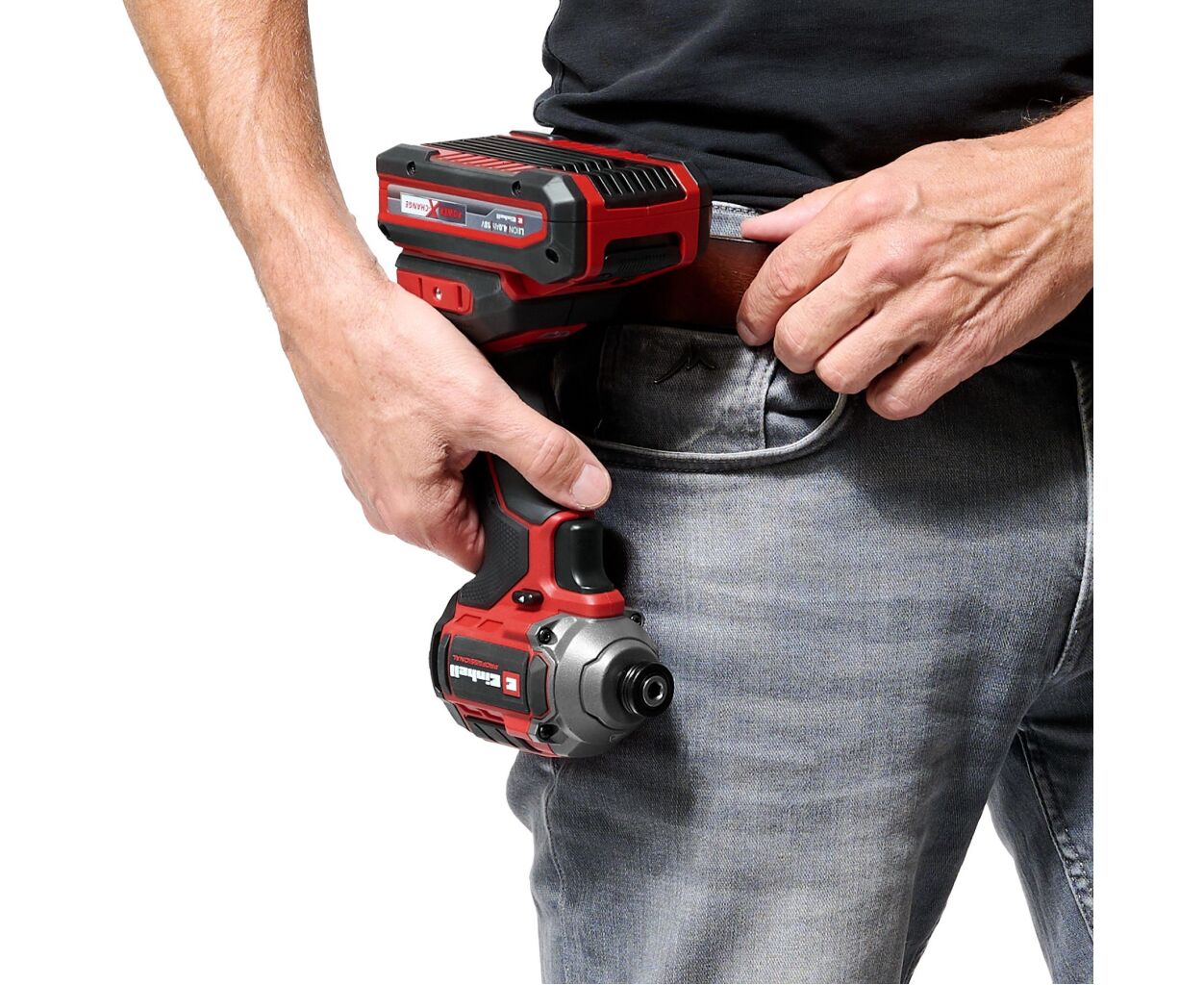 Зажим для ремняАккумуляторный ударный гайковерт имеет зажим для ремня, что позволяет безопасно держать инструмент на поясе.