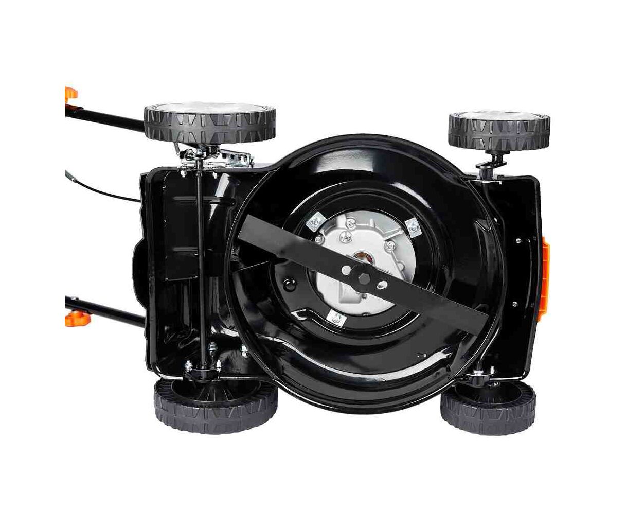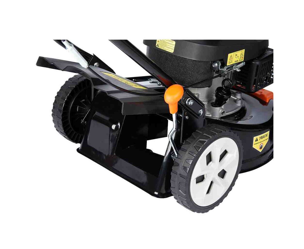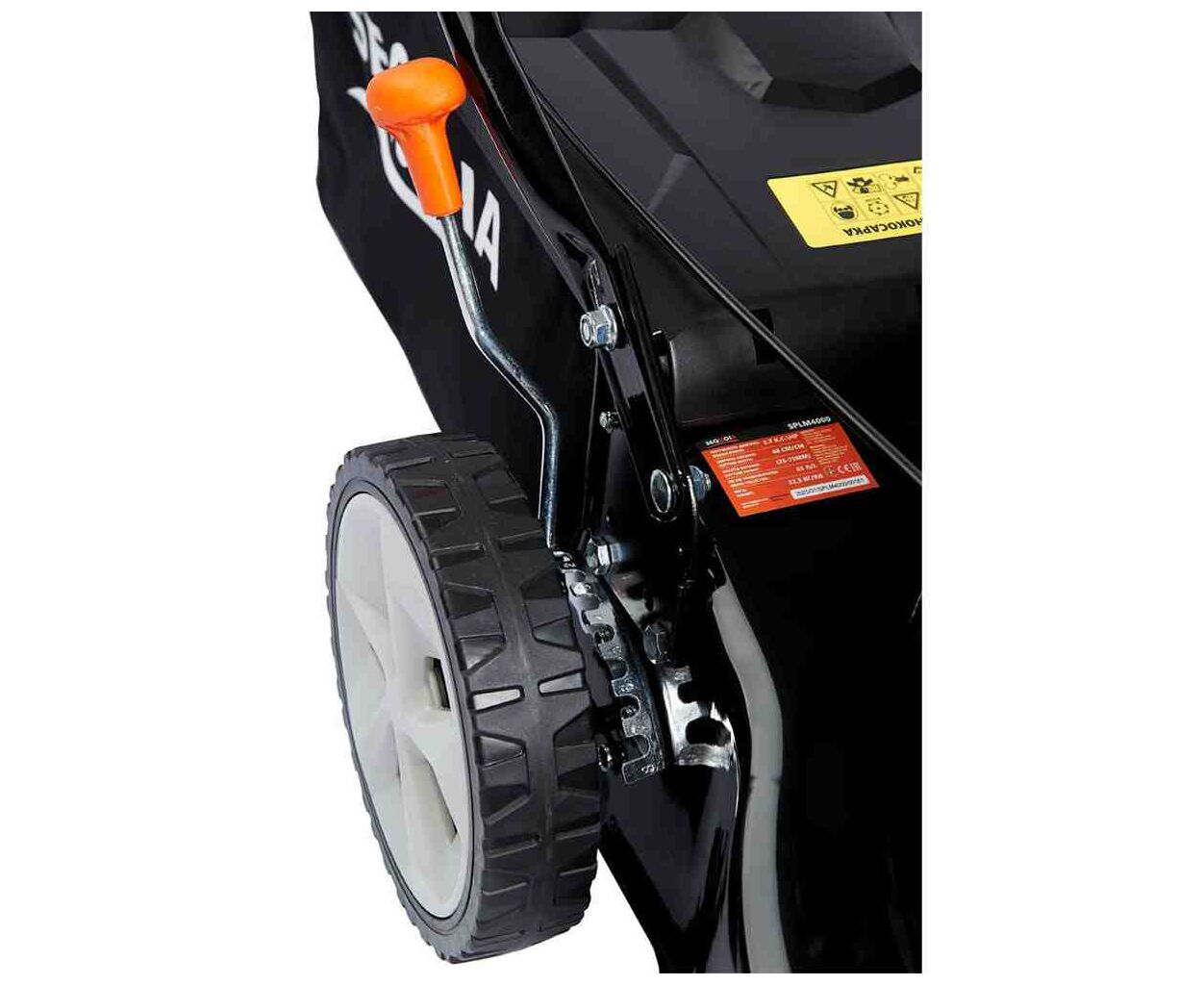 ✔ Оснащена мощным 4-тактным двигателем объёмом 99 см3, имеет функции сбора травы, центральную регулировку высоты скашивания (8 положений, от 25 до 75 мм).