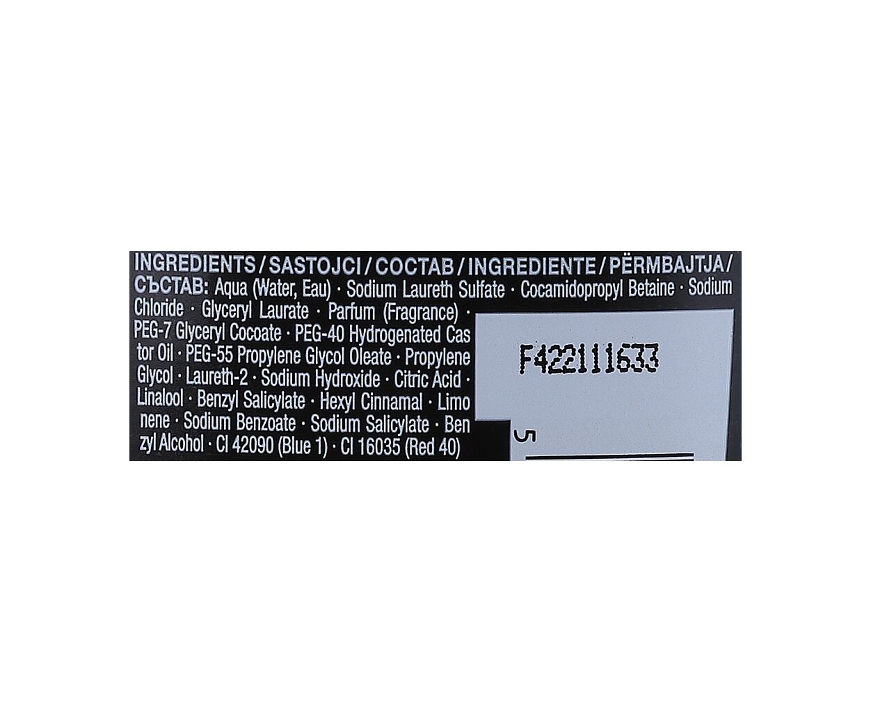 - Aqua, Sodium Laureth Sulfate, Cocamidopropyl Betaine, Glycerin, Sodium Chloride, Menthol, Niacinamide, Parfum, PEG-40 Hydrogenated Castor Oil, Citric Acid, Linalool, Benzyl Salicylate, Hexyl Cinnamal, Butylphenyl Methylpropional, Limonene, Sodium Benzoate