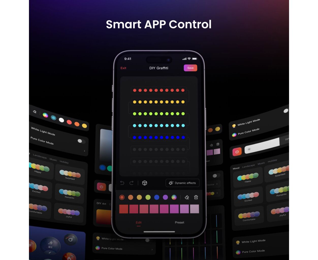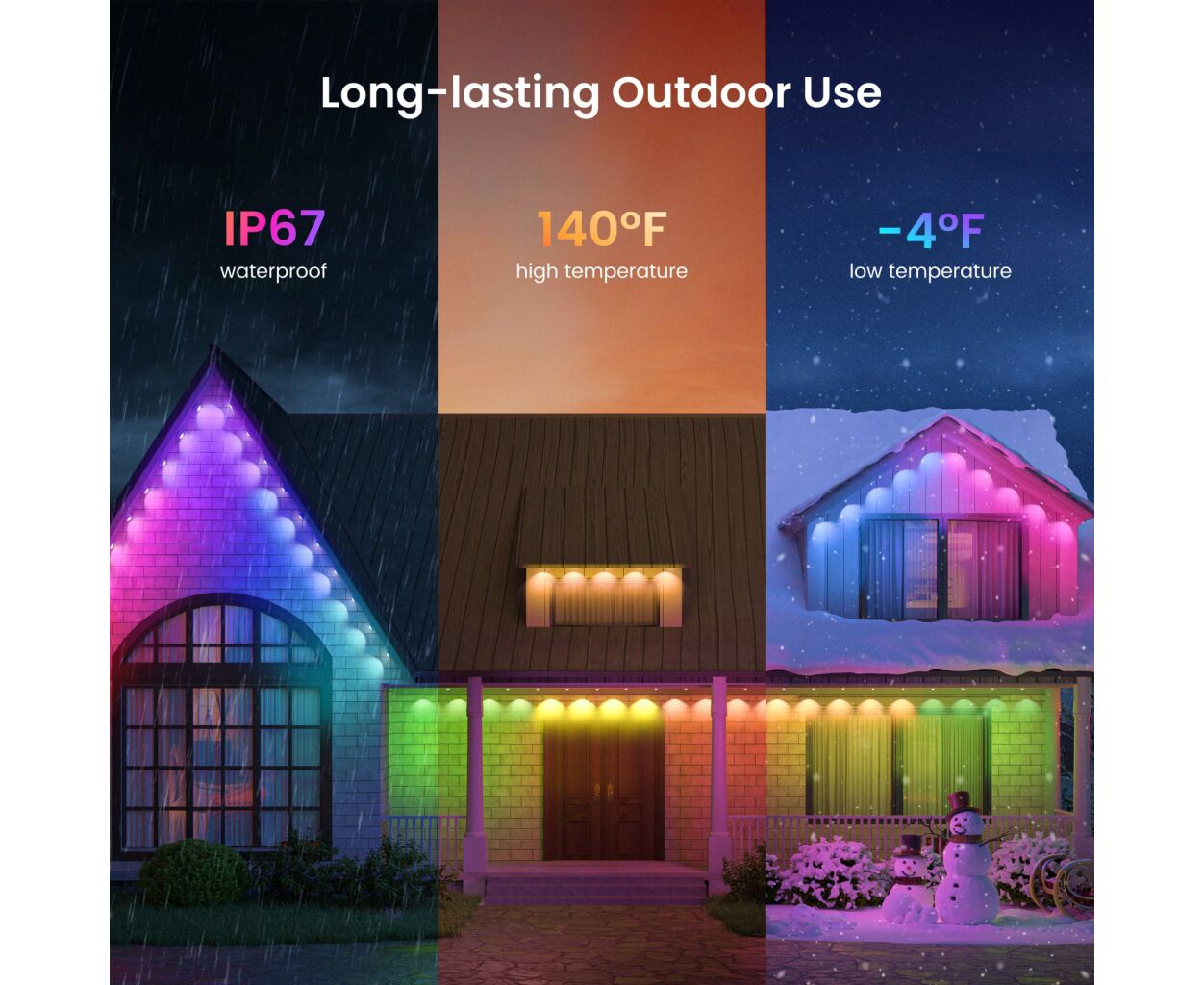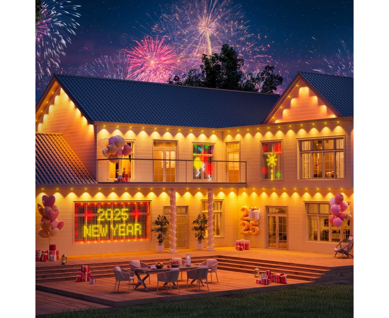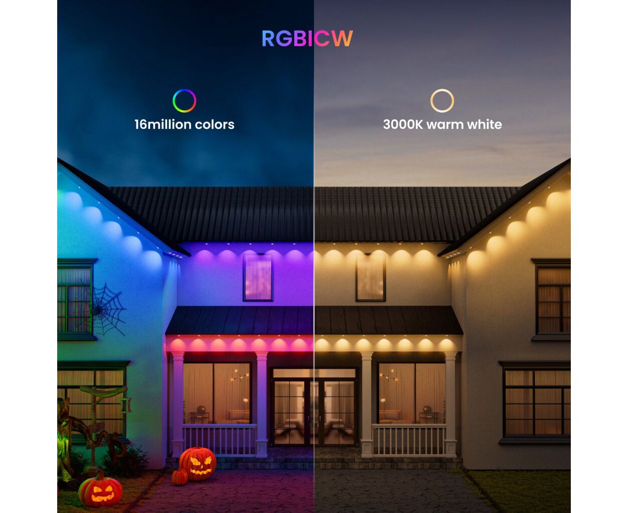 Уникальные возможности RGBICW-технологии открывают множество вариантов цветовых комбинаций: каждый сегмент может светиться индивидуально, сочетая яркие RGB-эффекты с тёплым и холодным белым светом. Благодаря классу защиты IP65, гирлянда надёжно защищена от пыли и влаги, что делает её идеальной для круглогодичного использования на улице.