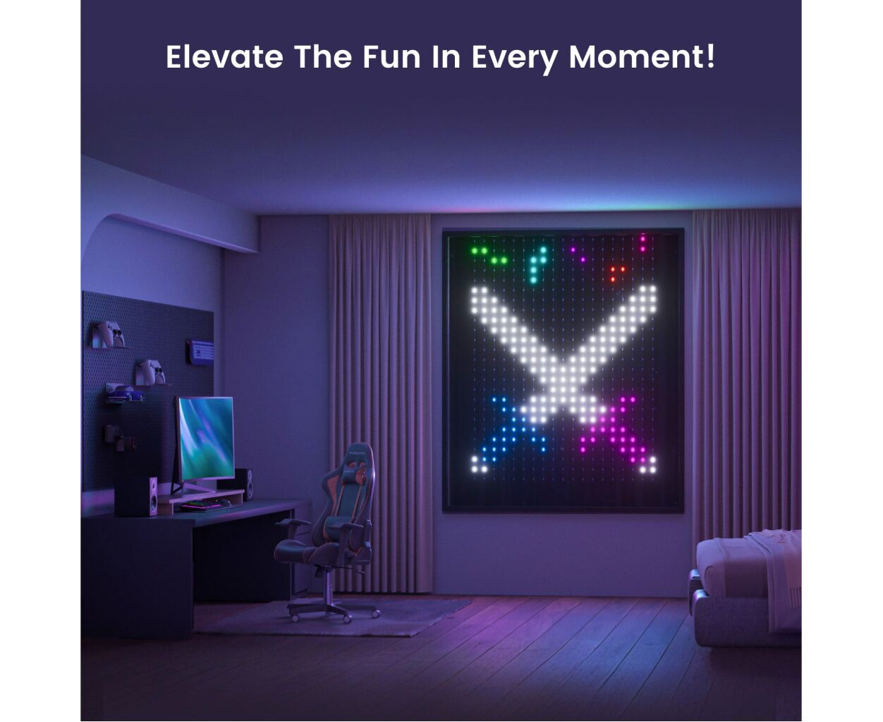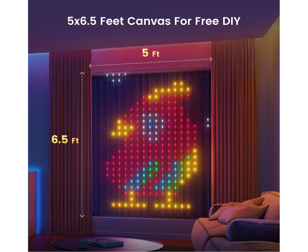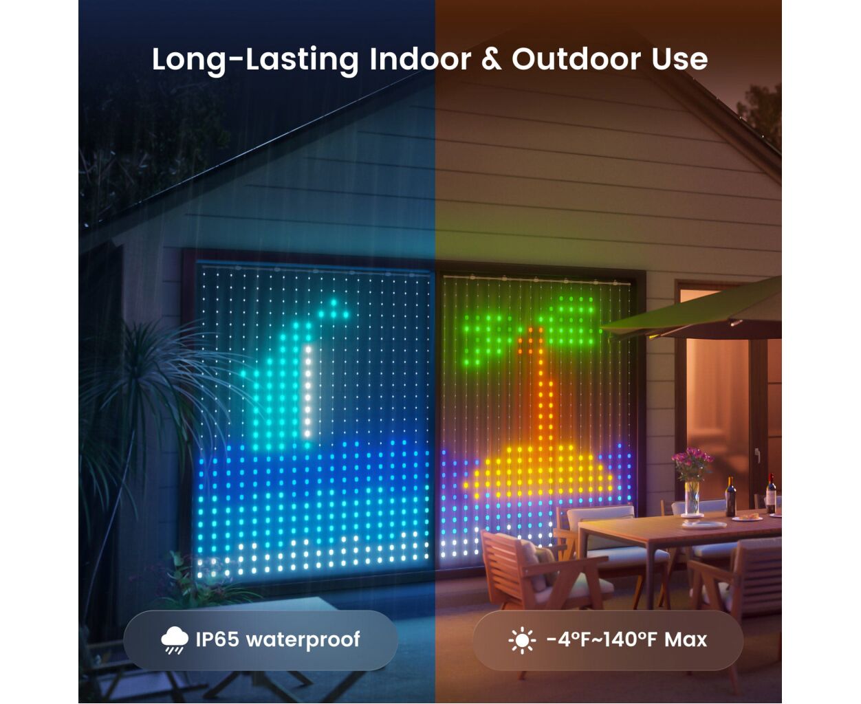 Гирлянда формирует яркие градиенты благодаря 475 цветным LED-диодам, обеспечивая палитру в 16 миллионов оттенков. Выбор из более чем 190 динамических анимаций и 170 статических шаблонов позволяет найти оптимальную атмосферу для любого события. Длина гирлянды 1.52 м идеально подходит для украшения как помещений, так и открытых пространств, ведь класс защиты IP65 гарантирует устойчивость к влаге и пыли.