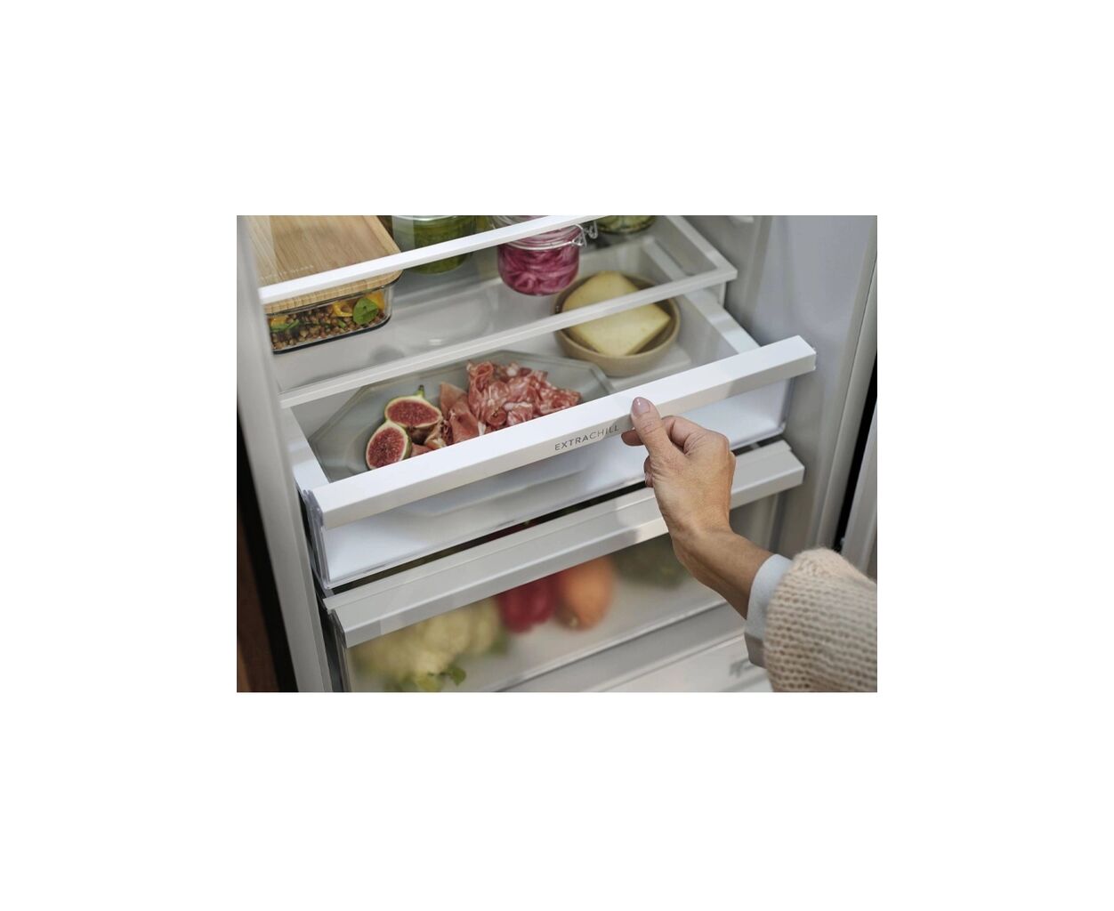 Система CustomFlex® позволяет легко настроить внутреннее пространство дверцы по вашим потребностям. Контейнеры удобны для транспортировки, так как их можно снимать и реорганизовывать. А для бережного хранения деликатесов, таких как сыр или мясные нарезки, предназначен выдвижной ящик Extra Chill, который поддерживает низкую температуру благодаря активной циркуляции холодного воздуха.