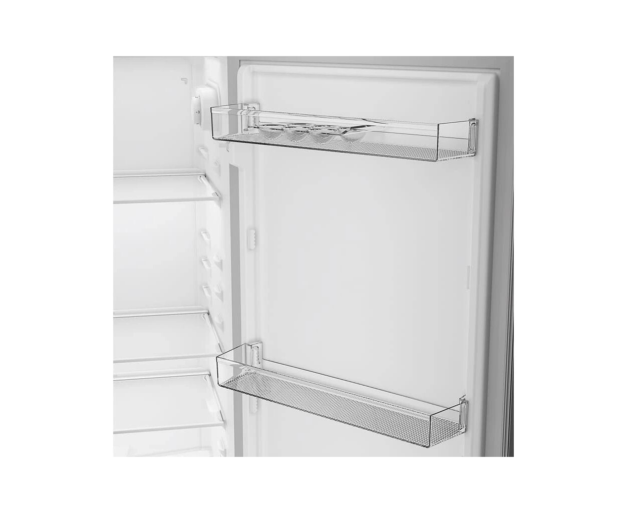 Особое внимание заслуживает его внутреннее оснащение. Холодильник включает в себя 4 полки из закаленного стекла, которые не только выдерживают значительные нагрузки, но и легко очищаются. Пространство дверей дополняют три удобные корзины и полка для бутылок. Специальный контейнер для овощей и зона свежести сохраняют ваши продукты свежими и сохраняют их натуральную текстуру и вкус.