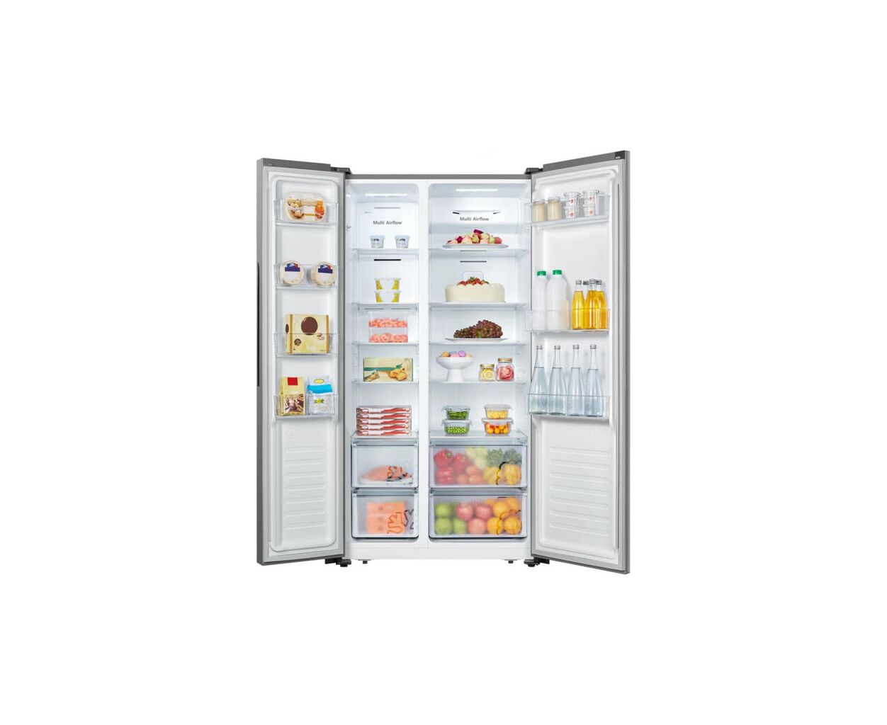 отдельностоящий, side-by-side, Общий объем холодильника - 442 л, Система разморозки No Frost - холодильное+морозильное отделения, E, обычный, Оснащение - контейнер для овощей, диспенсер, Полезный объем холодильной камеры - 291 л, Полки холодильной камеры - 3 шт, Полезный объем морозильной камеры - 151 л, Количество секций в морозильной камере - 3 шт, 39 дБ, 177 см, 91 см, 58 см, 73 кг, Цвет - нержавеющая сталь