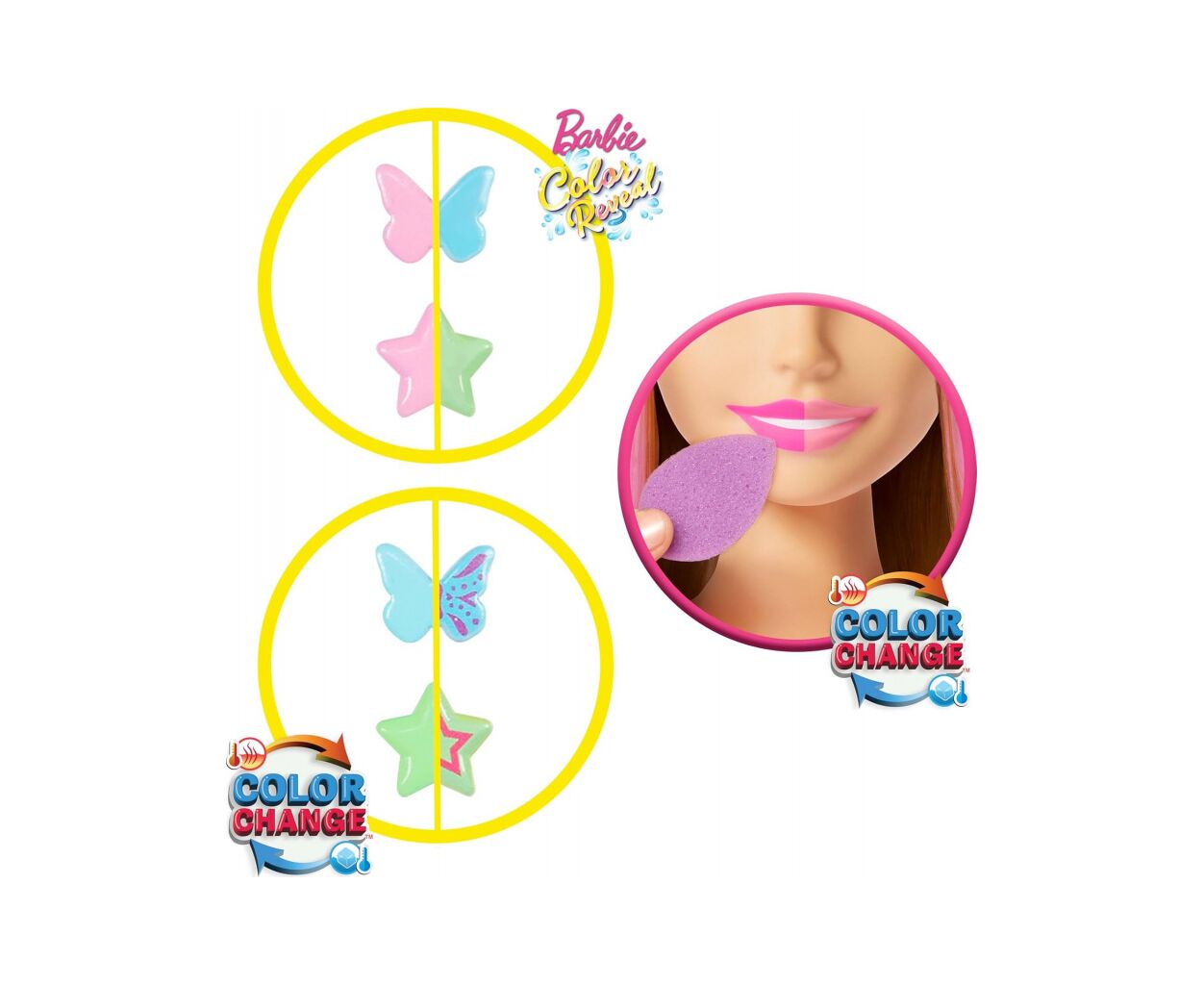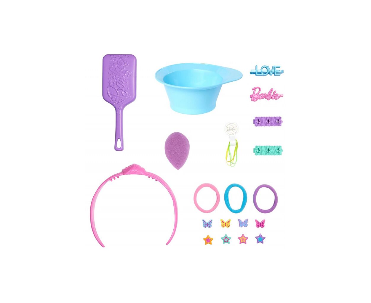 • голова-манекен Barbie с цветными волосами, специальная мисочка для воды и губка для изменения цвета аксессуаров и губ, щетка для волос, резинки, обруч, шпильки и заколки